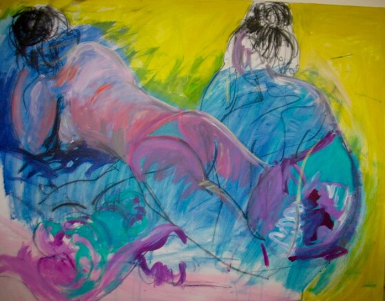 I can’t remember when I painted this originally – I think it was around 10 years ago. It was sketchy and pale missing something. I used the same model for both figures but imagination and colour dictated the rest. I have begun a new art space with my friend Yvonne not far from my home. It was quiet and the painting was sitting there with my paints nearby. So here we are. ‘Two Women ‘ revamped.