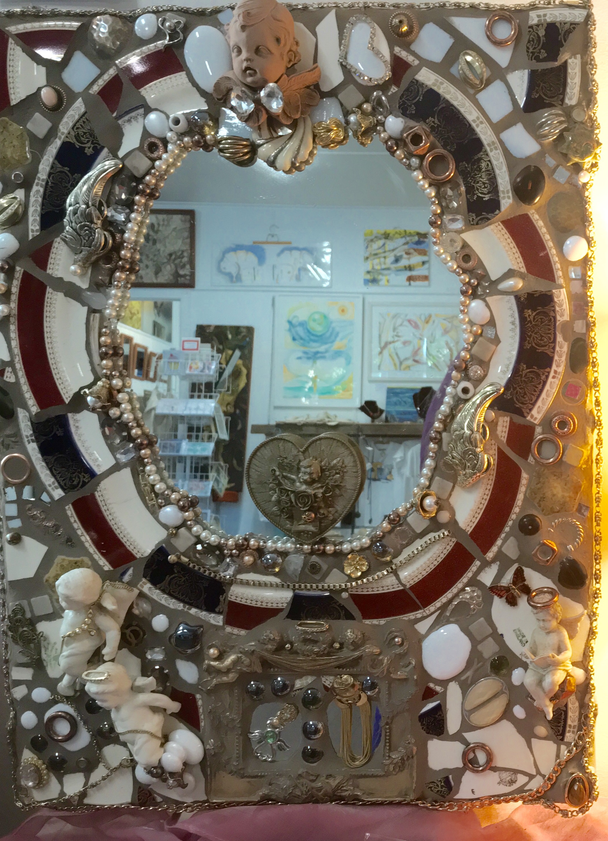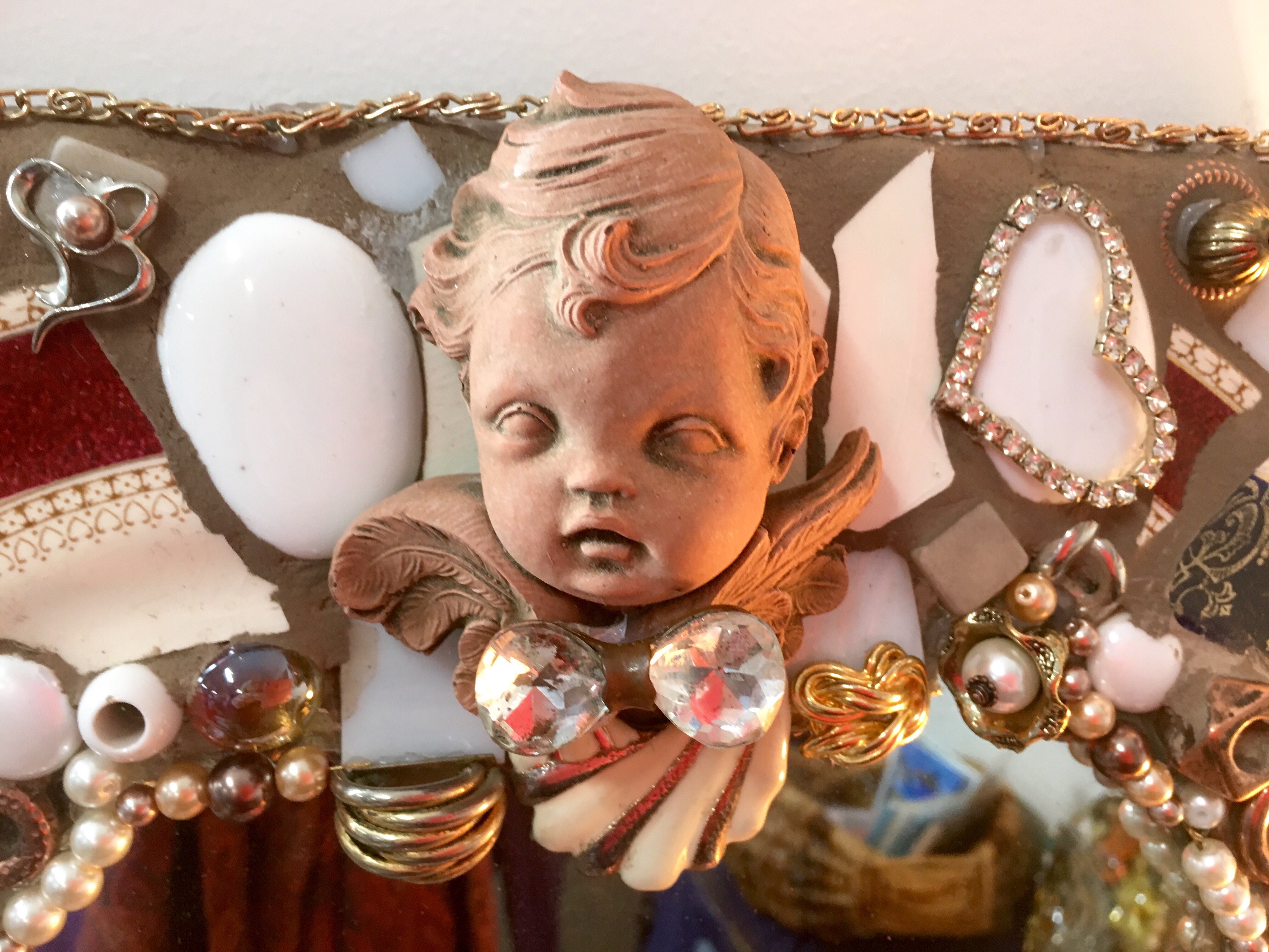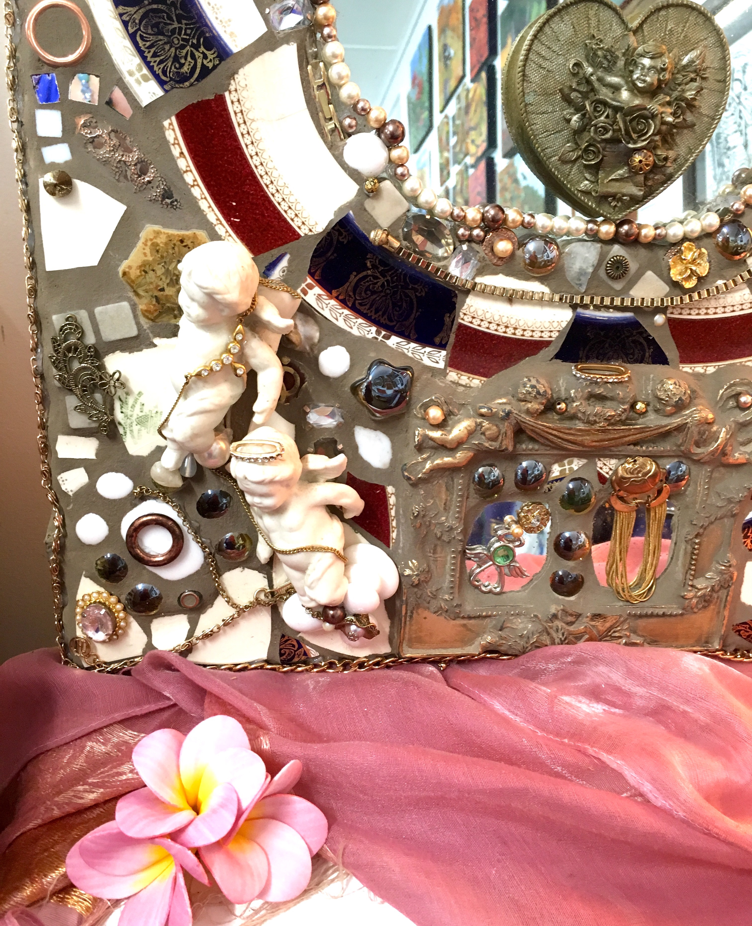 Whimsical and a bit of fun. I had collected a few Cupid collectibles and had been thinking of creating this mirror for a while. The base is a heavy old dressing table mirror and the white cupids on the left I broke from candle sticks. Gold jewellery, broken Westminster plates and pearls all came together with cinnamon coloured grout. Currently for sale in the Iluka Emporium, NSW.