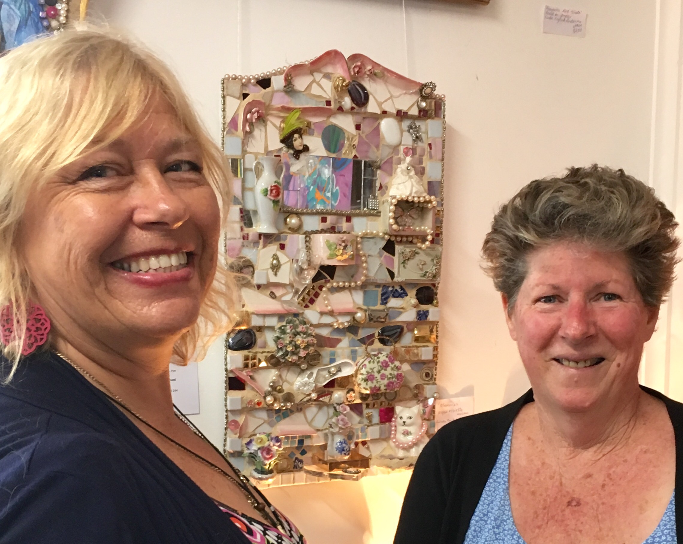 Since I’ve become a member of this creative co-operative I have had a permanent space to display my pique assiette mosaics, drawings, paintings, my 2 books, prints and cards. It’s currently school holidays and lots of people are coming through to enjoy the artwork and collectibles in the Iluka Emporium. Today I sold ‘Memories’ a pique assiette mosaic that embodies femininity and olde world charm. A little whymsical and nostalgic, the piece will be perfect in its new home, of which the new owner describes as ‘shabby chic’ or perhaps ‘boho.’