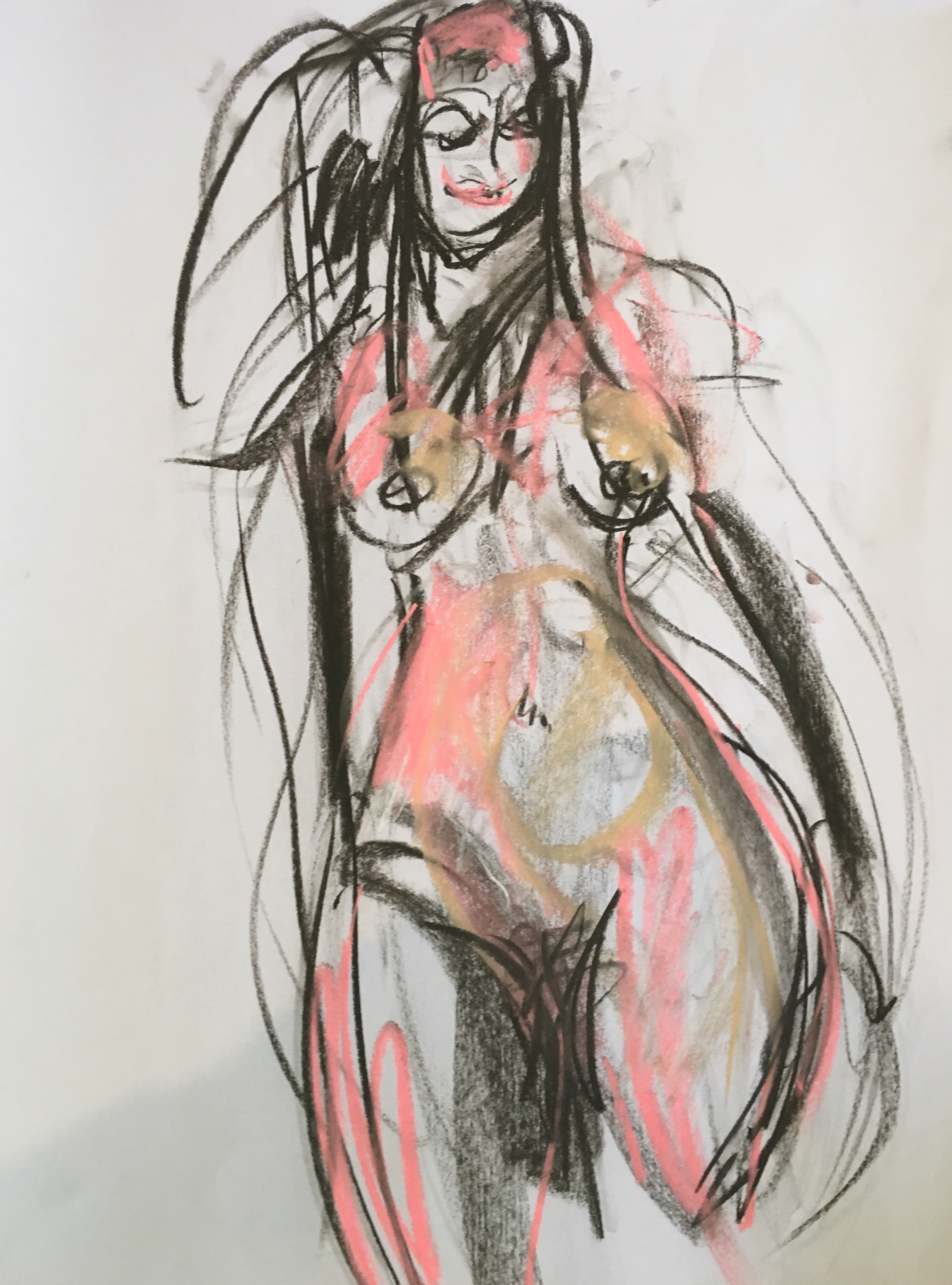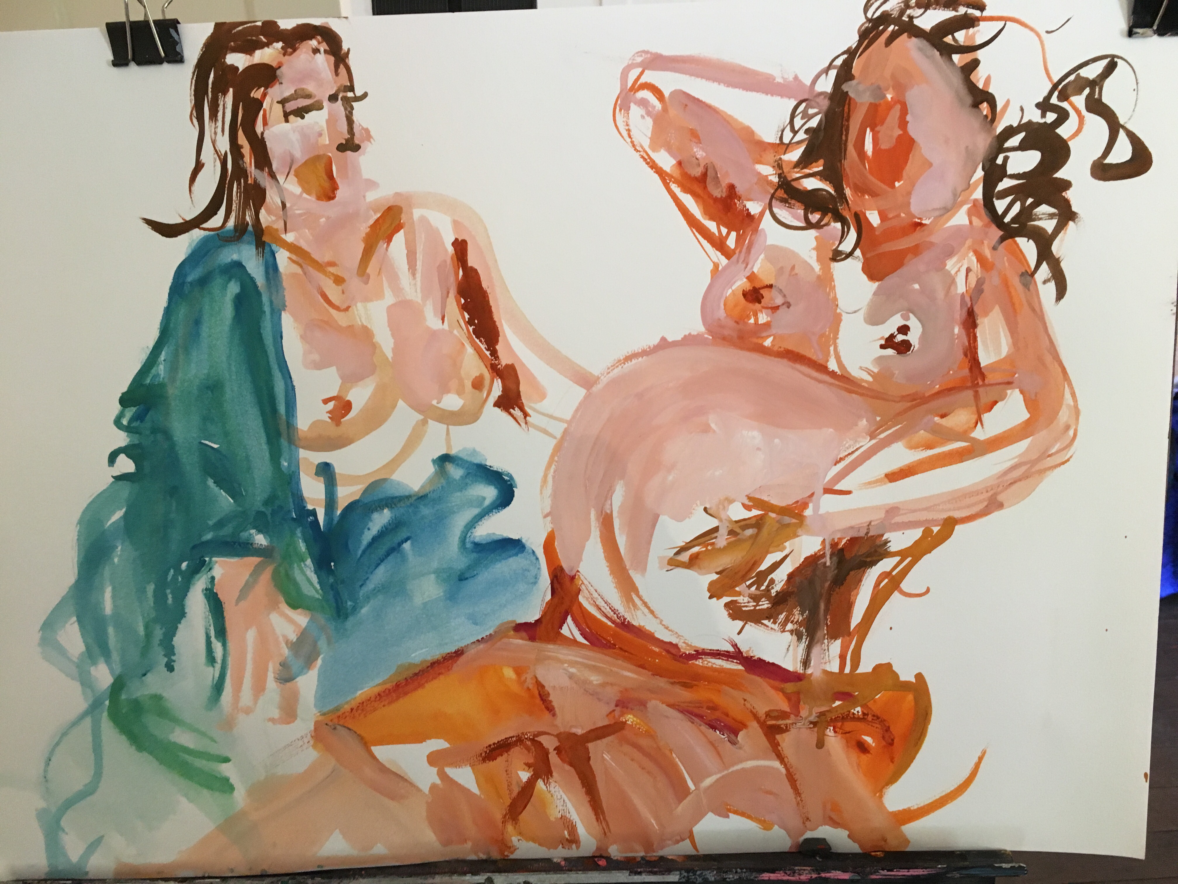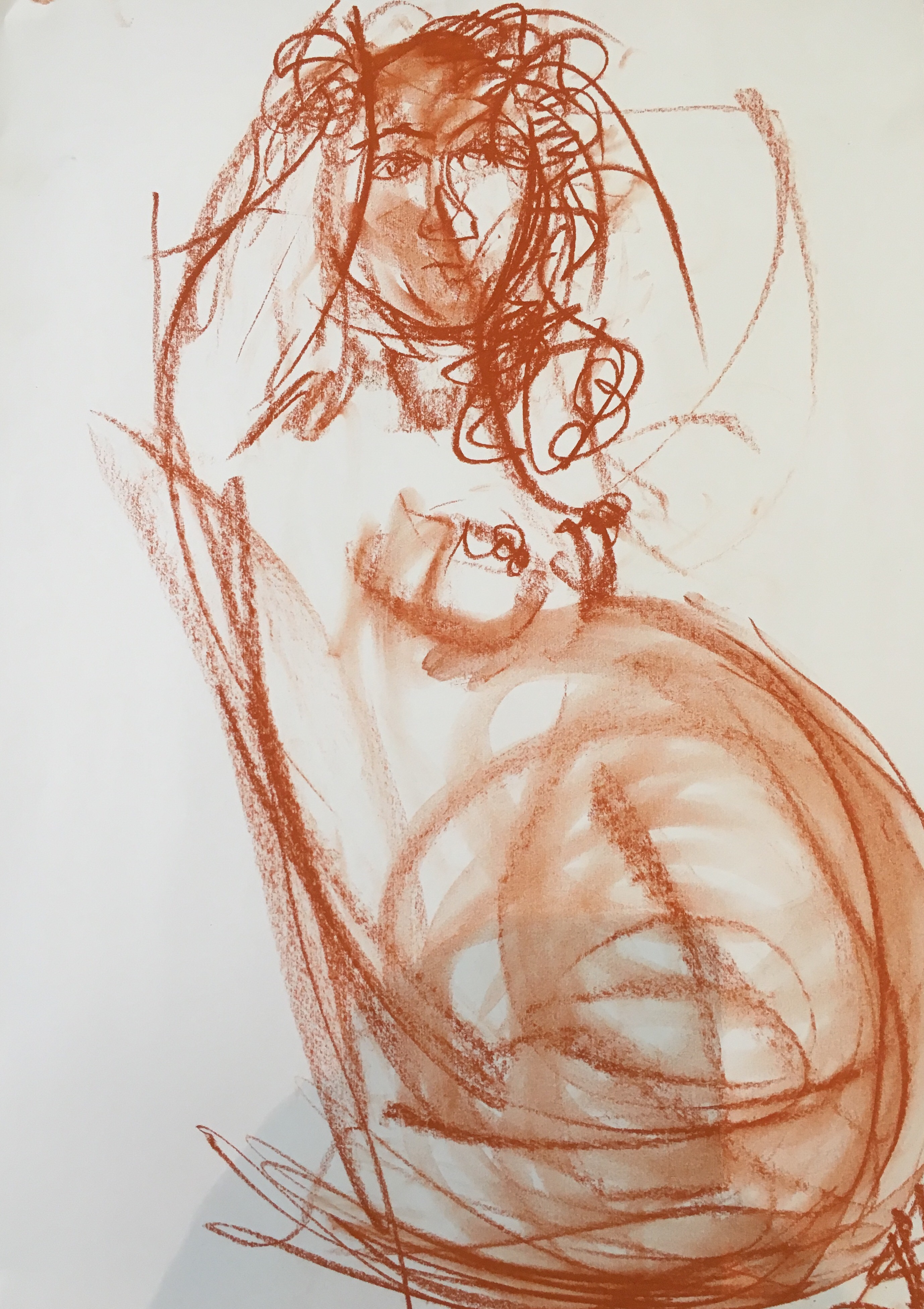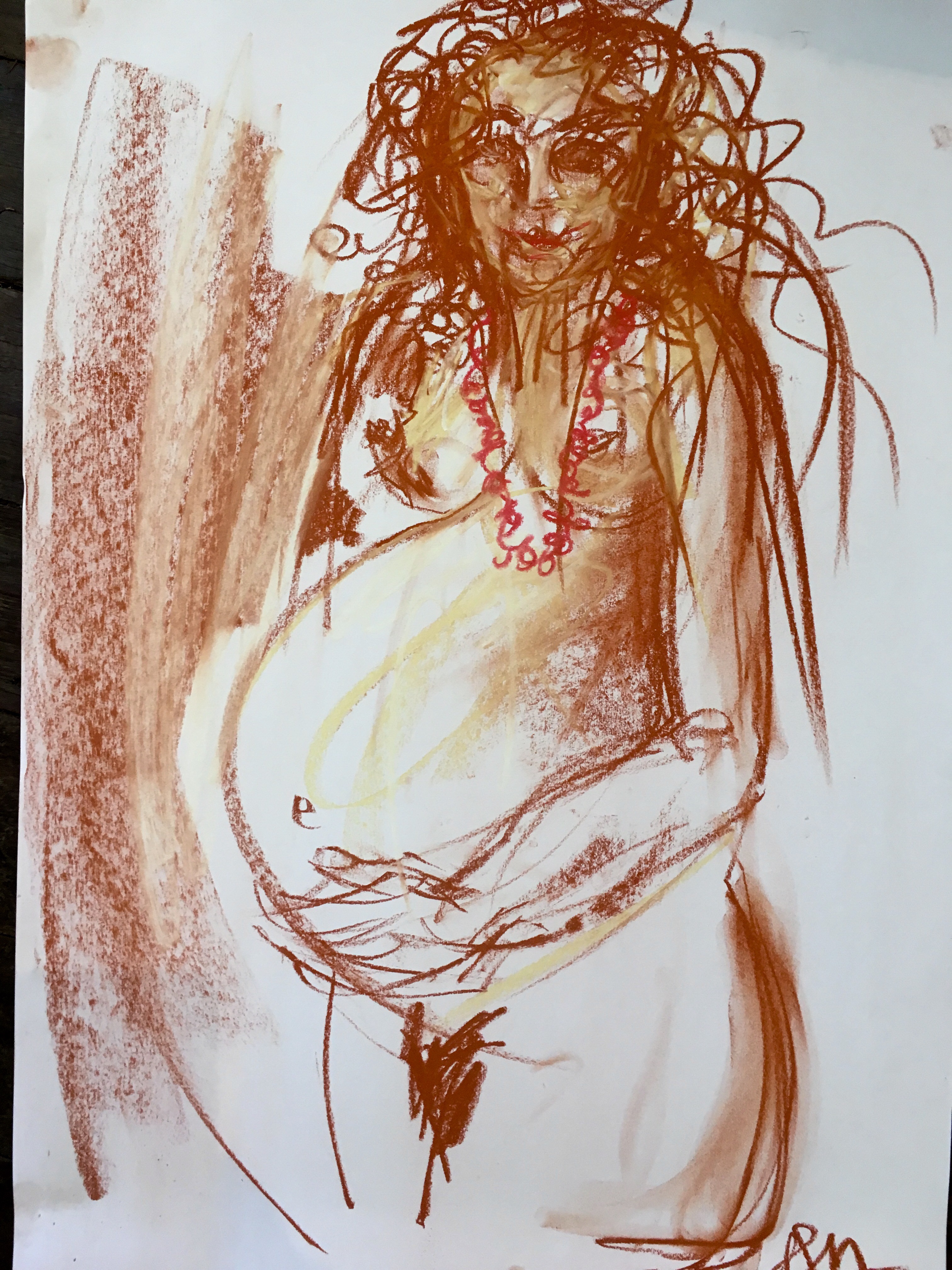 Another lovely morning with 2 beautiful models. Our gorgeous Djuana who loves to dress up and Emma about to give birth. I began with pastel, then pens, some gouache and back to pastels, the medium I am most familiar with.