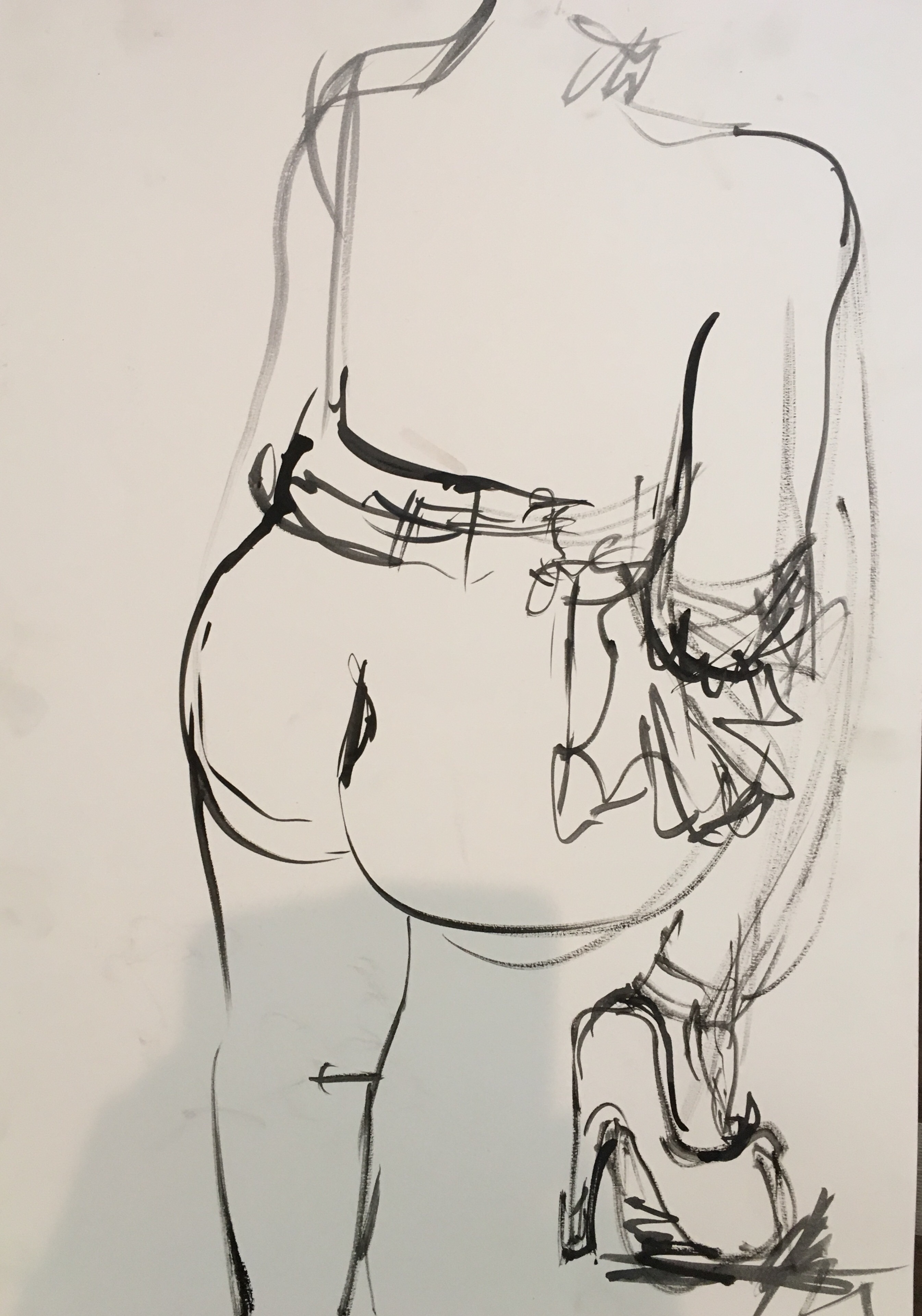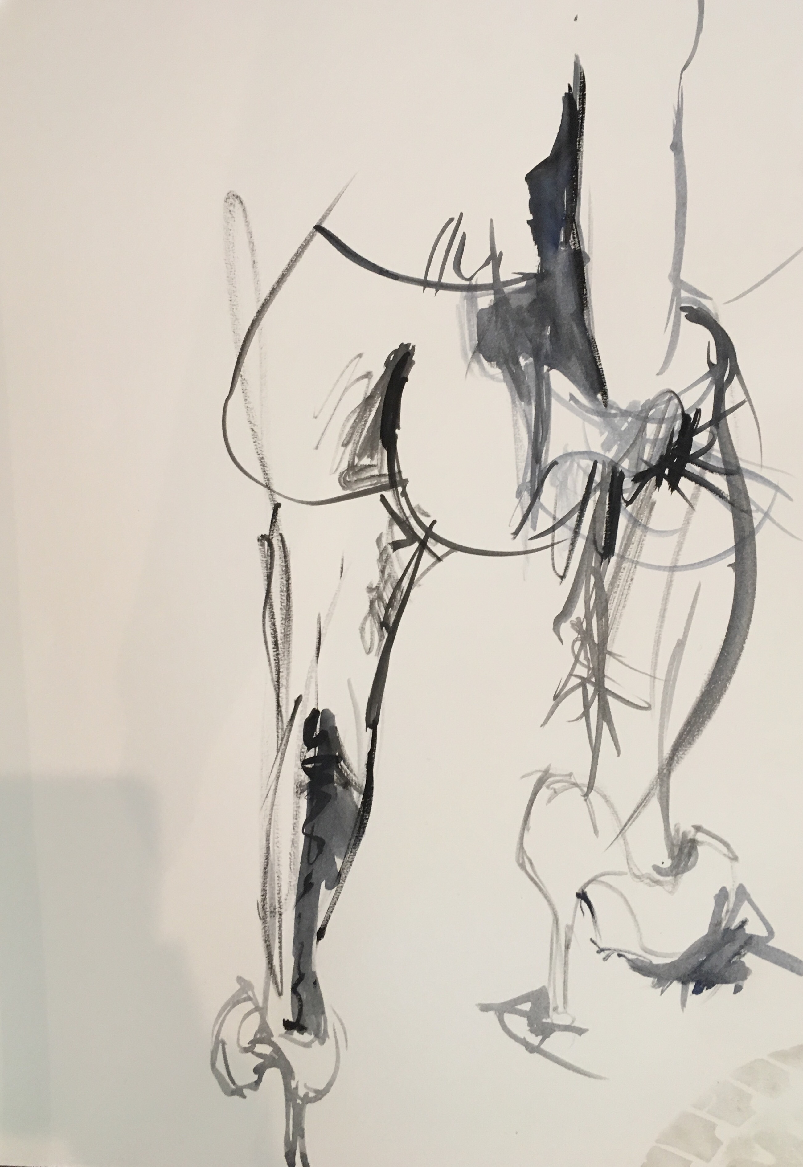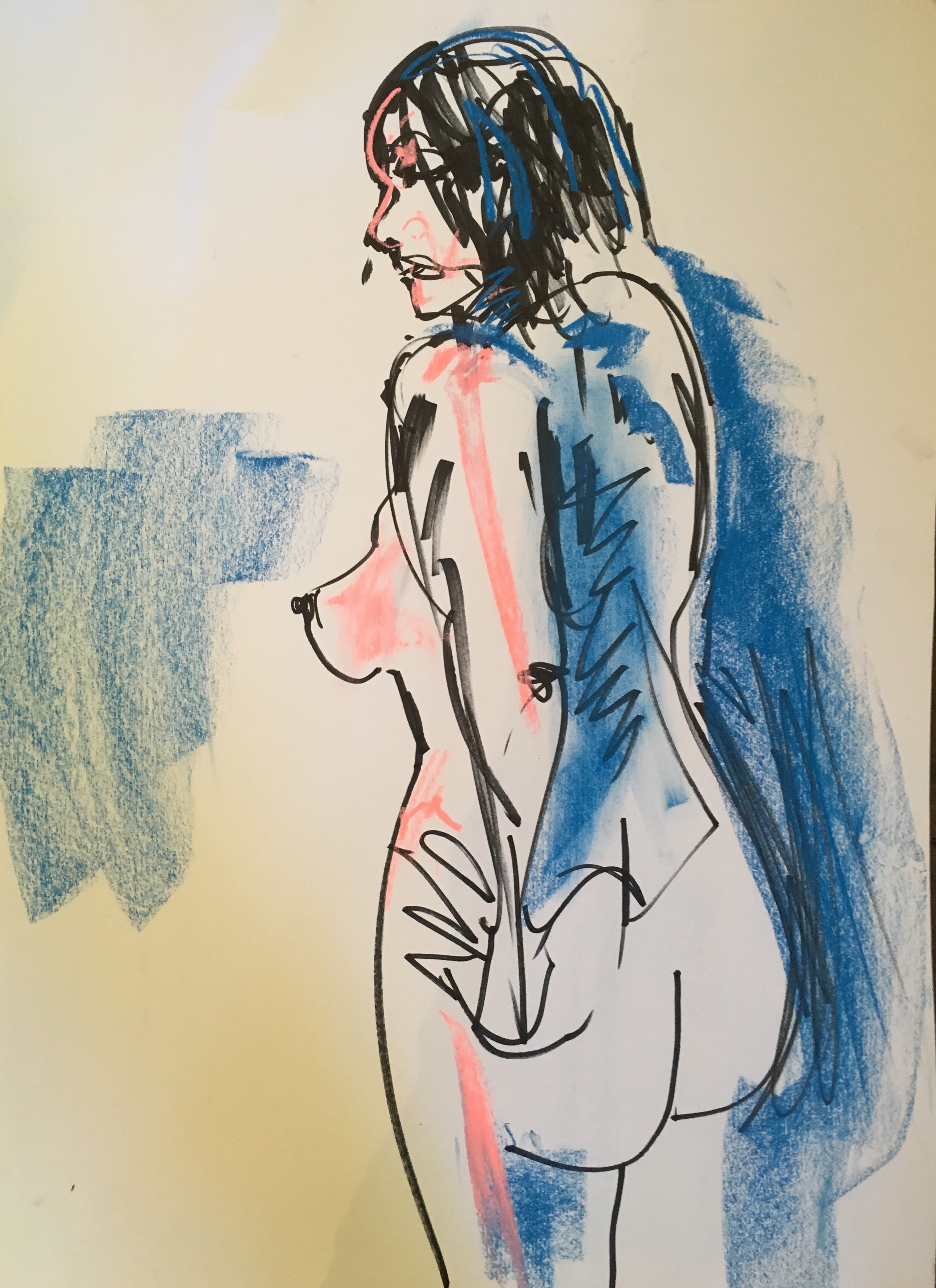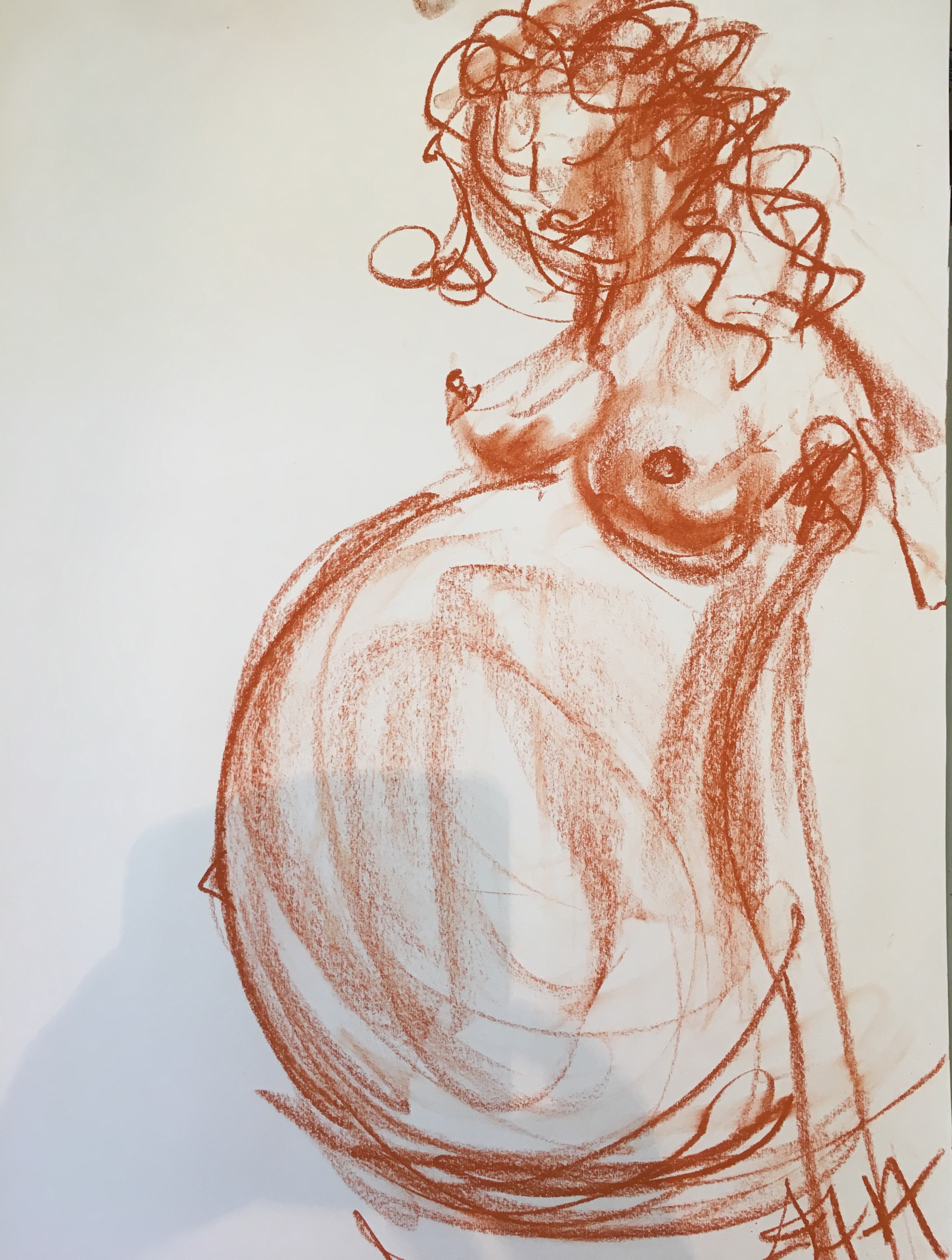 Another lovely morning with 2 beautiful models. Our gorgeous Djuana who loves to dress up and Emma about to give birth. I began with pastel, then pens, some gouache and back to pastels, the medium I am most familiar with.