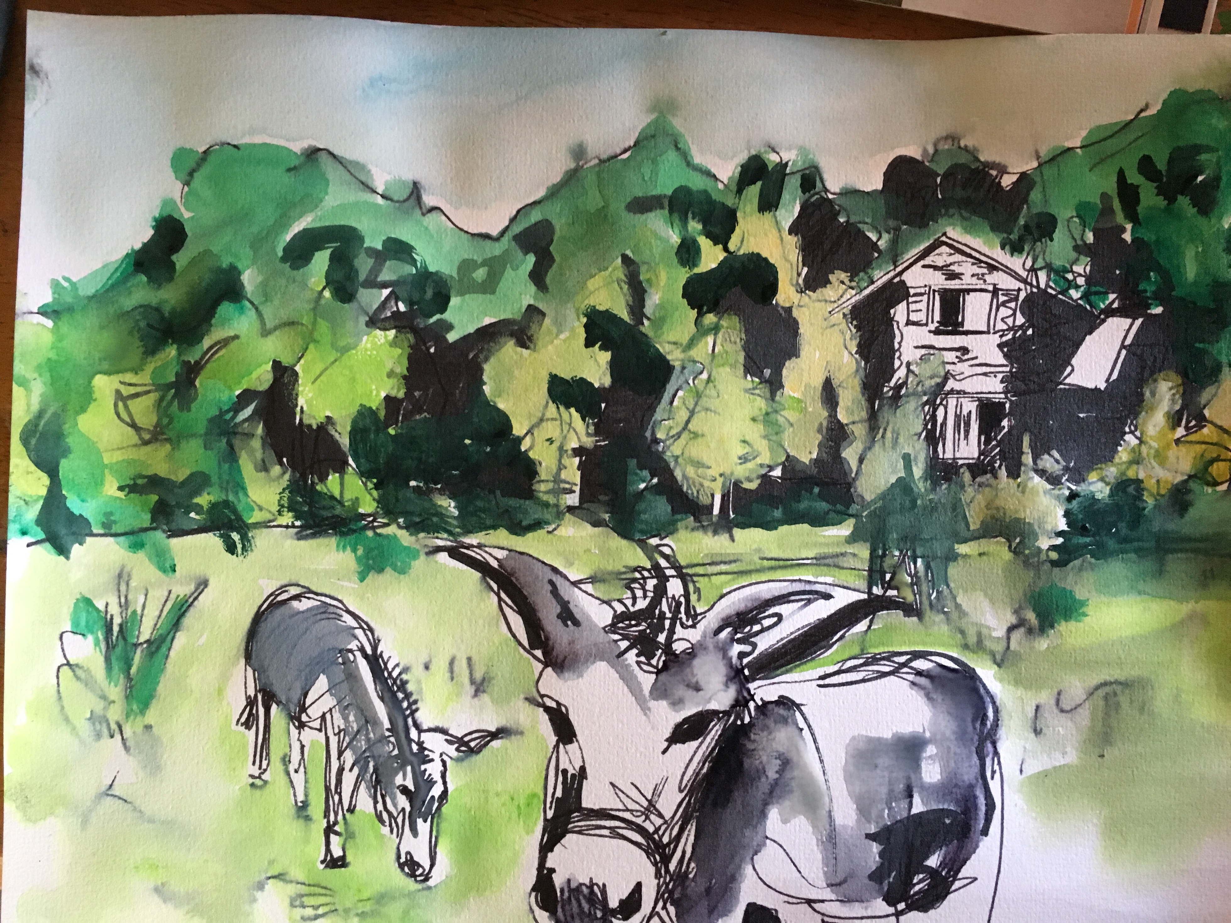 Anyone who knows me knows I love donkeys and draw/paint them whenever I can. I drew this one with ink then used watered down gouache on water colour paper. I wanted to create something special for my friend who has this beautiful home lovingly restored in the south of France. We have visited a few times and last time I was there I drew and photographed the donkeys. Apologies for the cut off at the bottom of the photo.