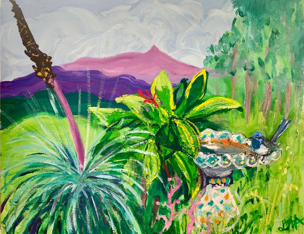Mt Wollumbin and a grass Tree have appeared again along with a little wren in the bird bath. Acrylic on canvas