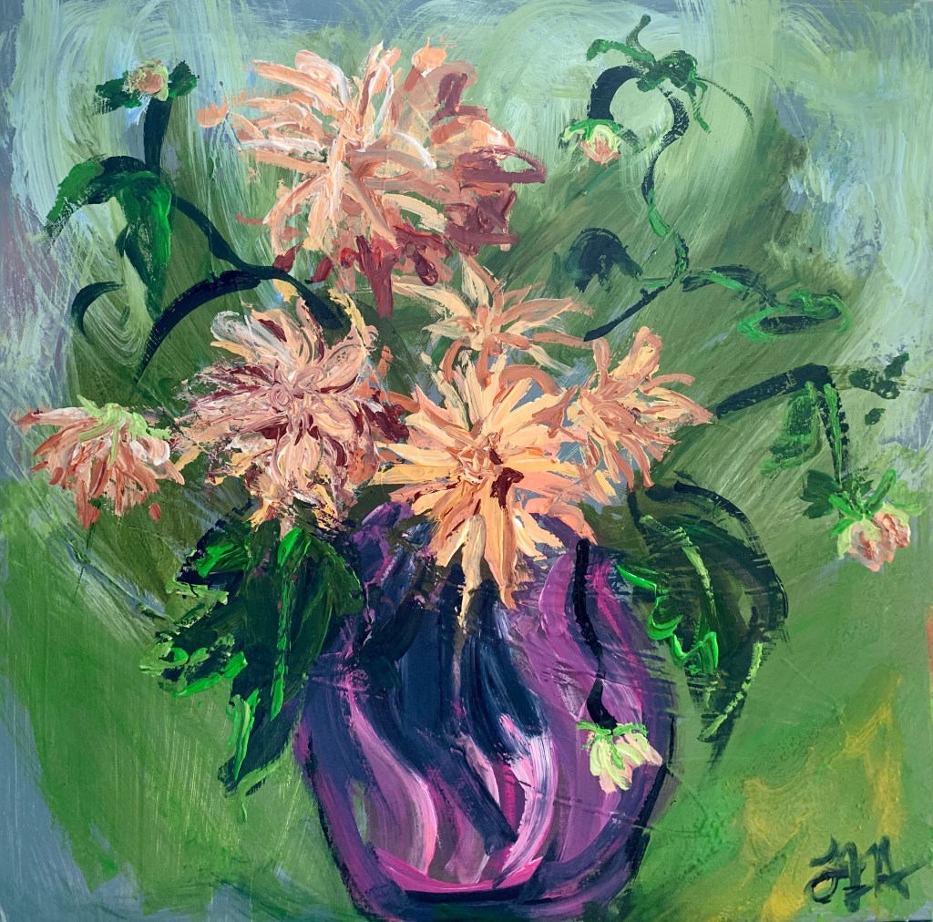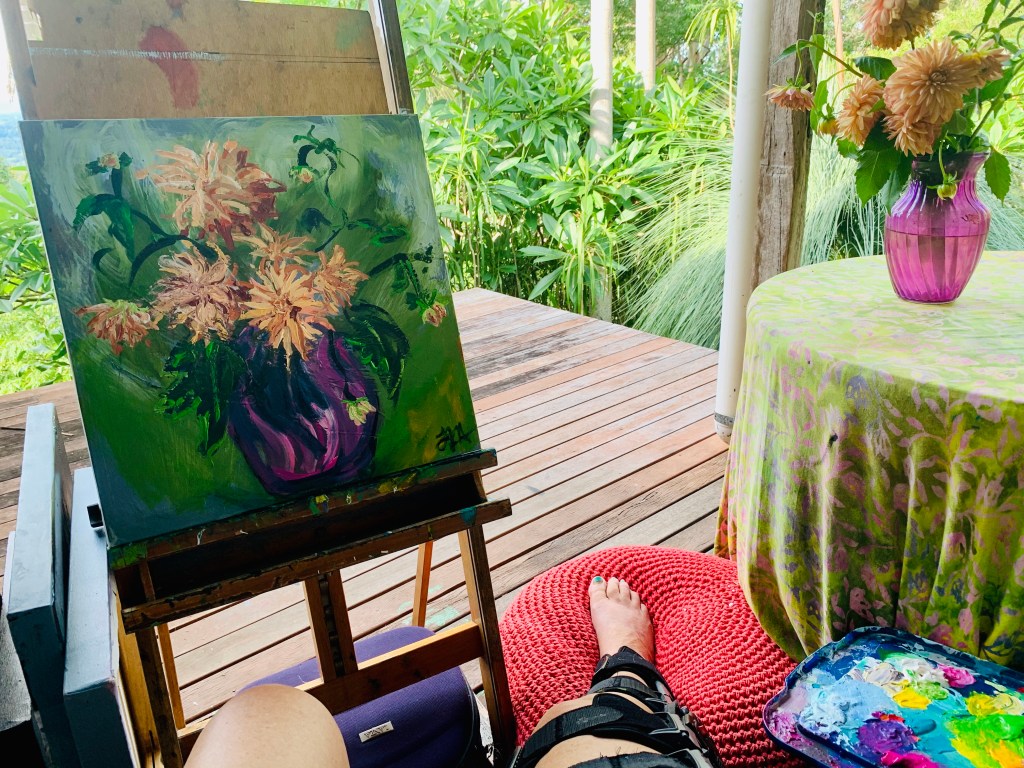 Beautiful big orange pastel dahlias are growing in my overgrown garden. My leg is still healing and currently in isolation on our mountain. I can’t help but be inspired by a Margaret Olley. The paint is still wet when I photographed the painting with my iPhone. Happy flowers. Acrylic on canvas.