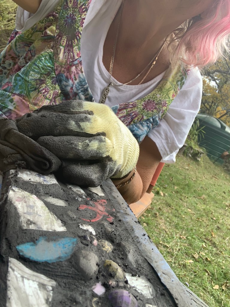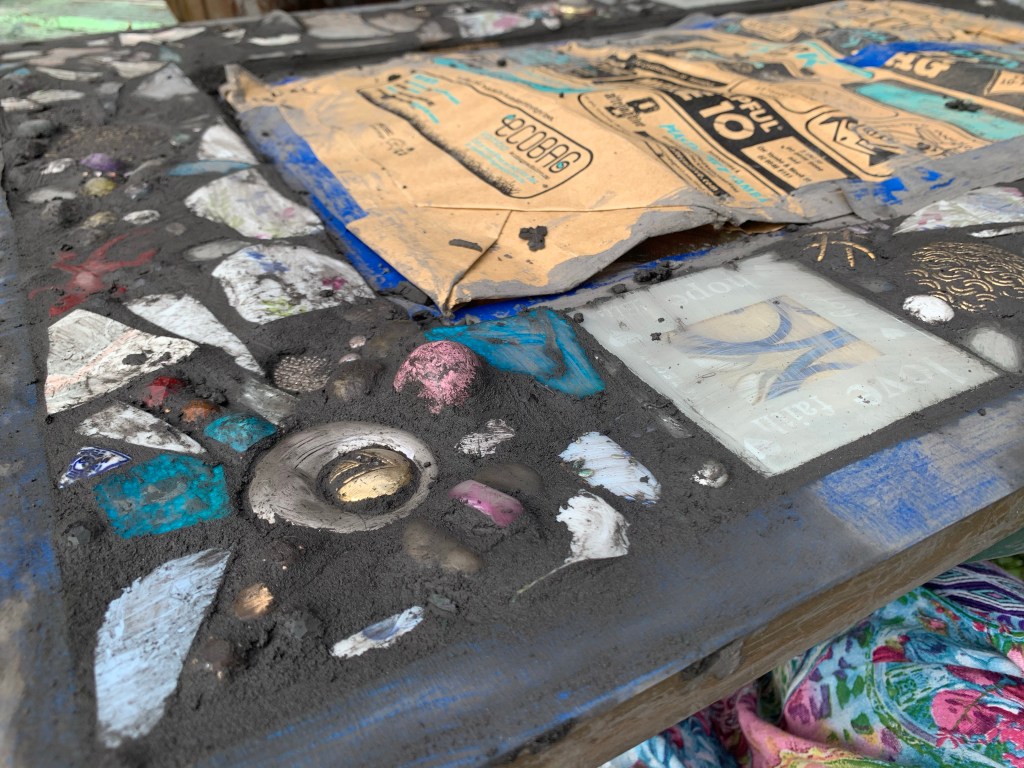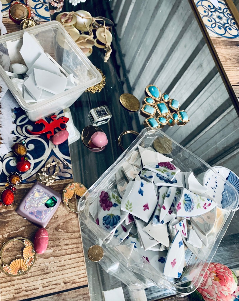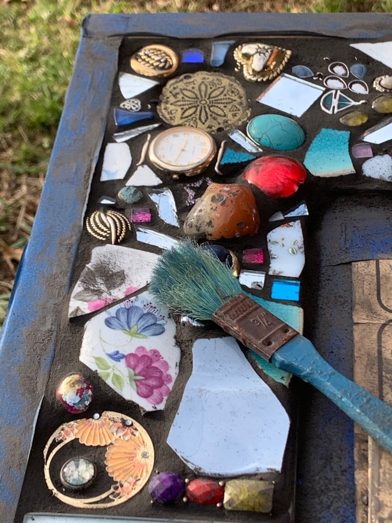 Pique assiette Mosaic making is fun and has a whimsical feel. It’s akin to meditation at times as it takes time collect, gather and create. Breaking the china with a hammer creates unpredictable pieces. Playing with patterns, shapes and colours in my own jigsaw way is an instinctive spontaneous not entirely planned process.