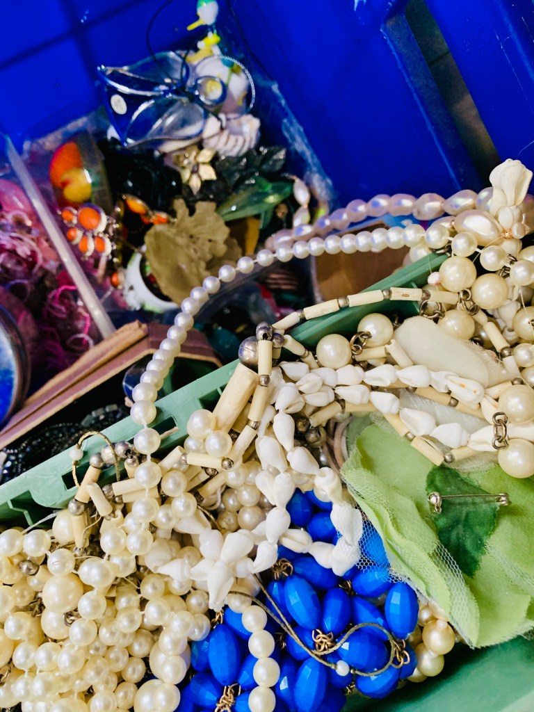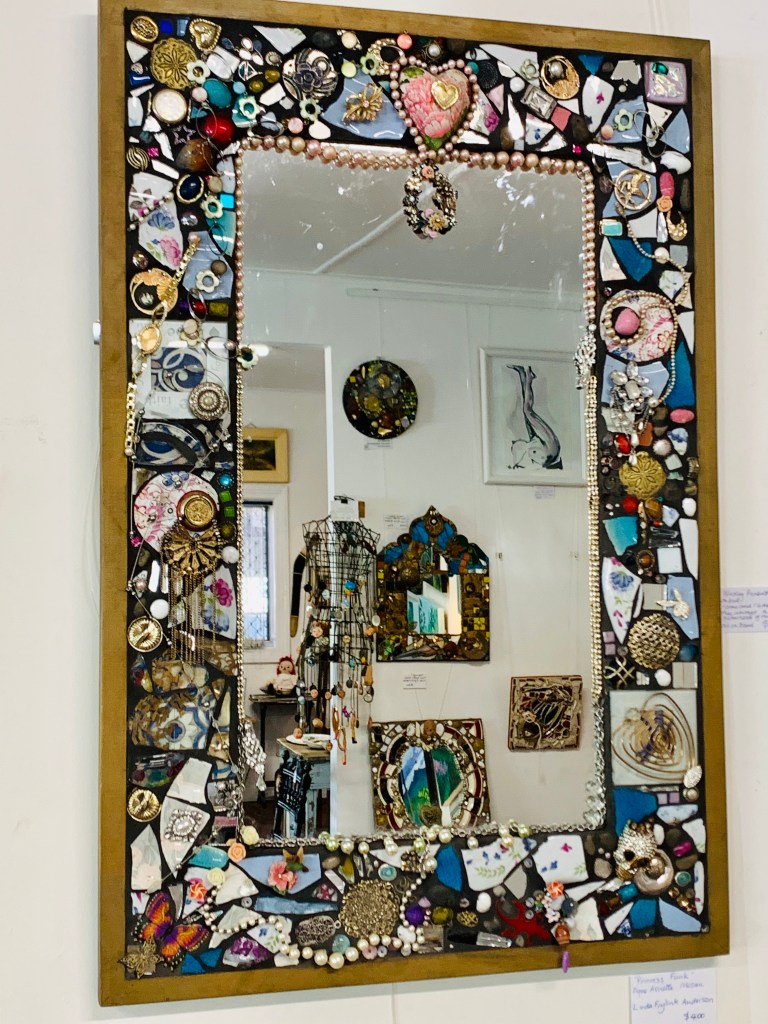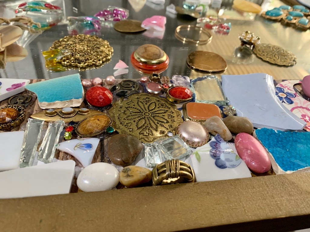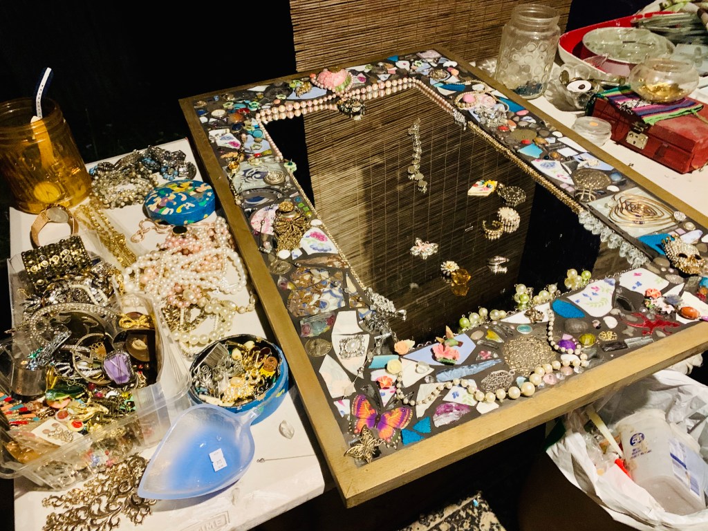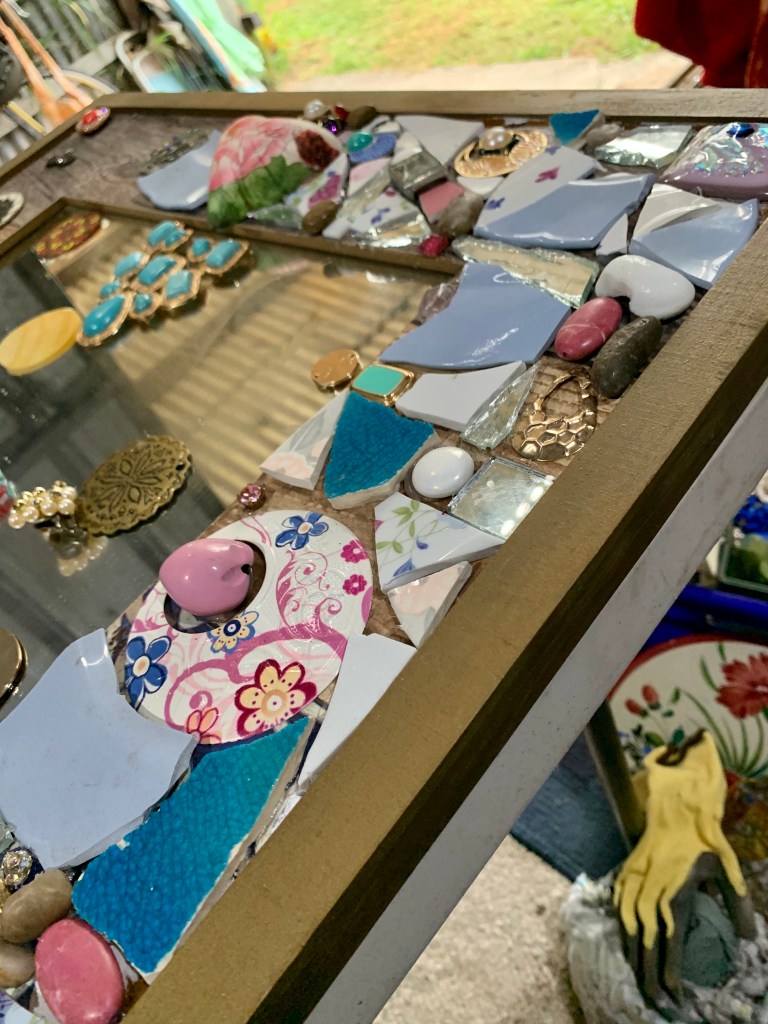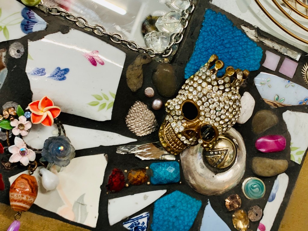 I had a large rectangular mirror with a frame stored in the shed so I began choosing pieces to go on it. I was thinking about blues pinks white and gold and began arranging the pieces as I glued each one with a silicon gun. The pieces to be grouted generally have to be flat on the bottom so I pull a lot of jewellery apart.