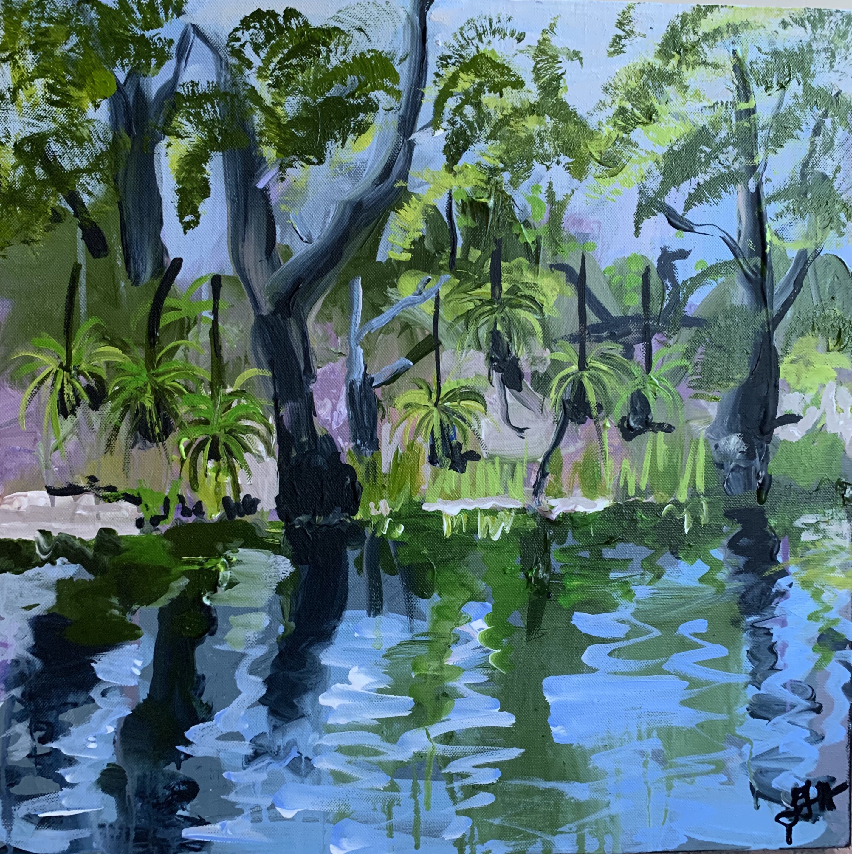 Inspired by the reflections and recovery of the plants and trees along the Esk river of Bunjalung National Park after the bushfires. Exploring by dinghy after recent rains I observed and photographed this very special place. These works are acrylic on canvas.