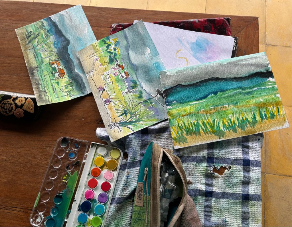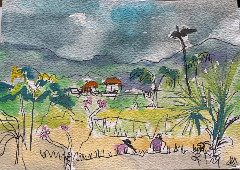 I’ve just returned from Bali and Lombok and was so relaxed I didn’t complete much artwork. Here’s a few scribbles from Sidemen, up in the hills and still has a feel of the ‘old Bali’. Our villa did have a view of Mt Agung behind the rice fields but it was covered in cloud. So I imagined it. watercolour and ink on watercolour paper.