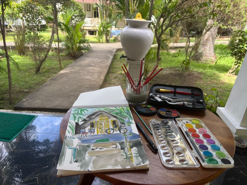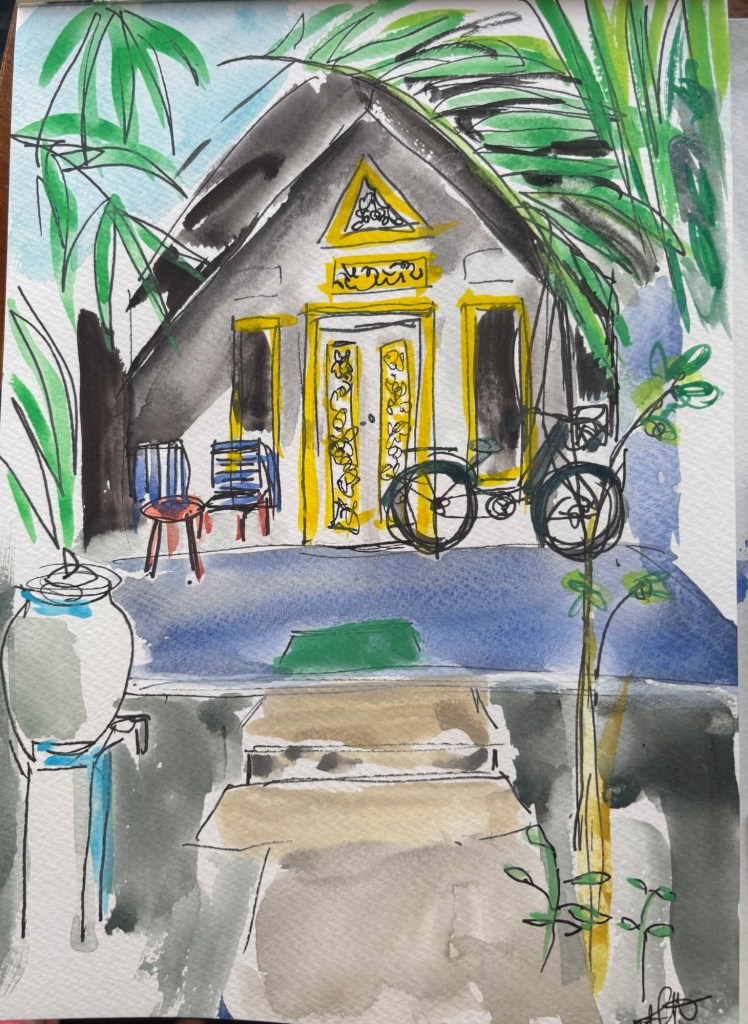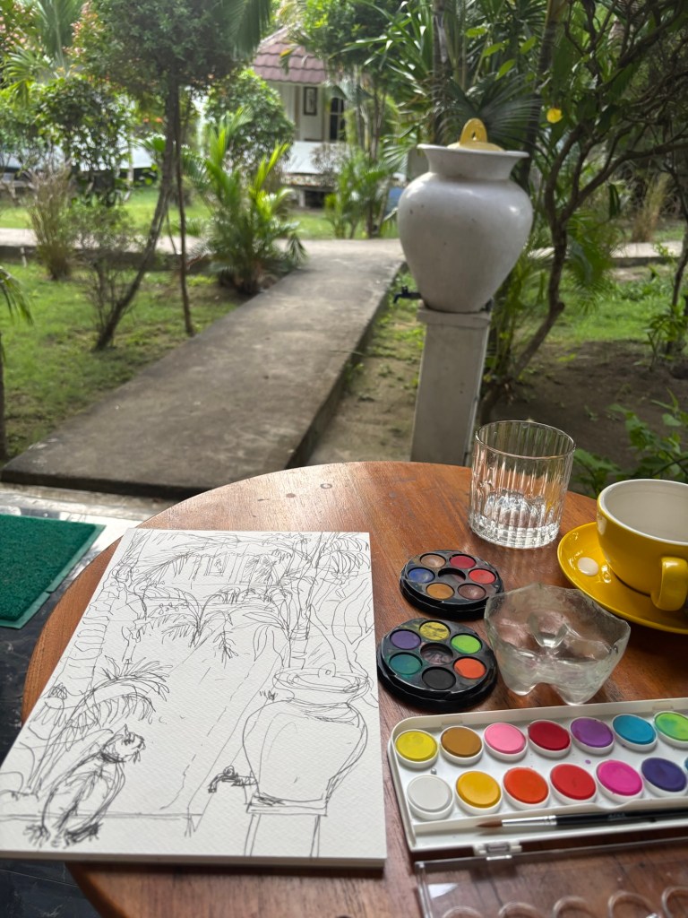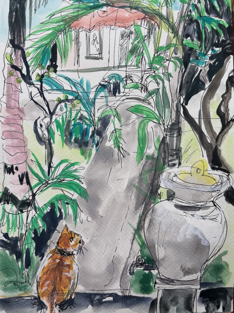 A holiday with my grandson included an island with no cars, just horse and carts and bicycles. We stayed in 2 little bungalows side by side a few steps from the beach. I enjoyed the company of 2 ginger cats, one is featured in one of these sketches with pen and watercolour.