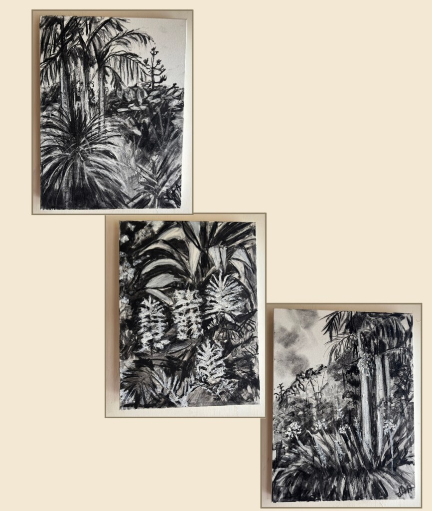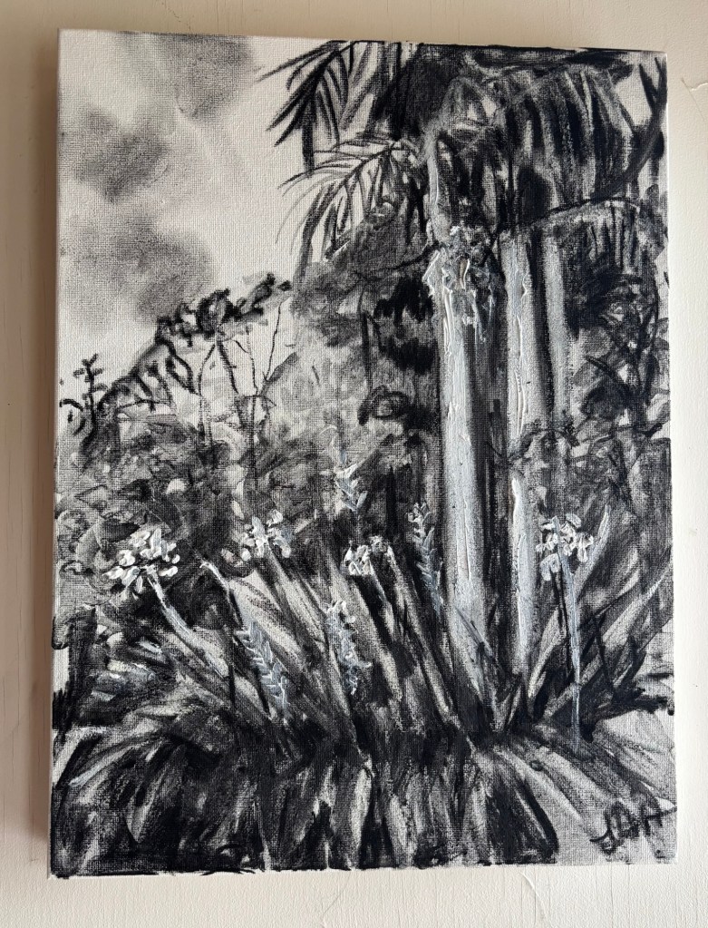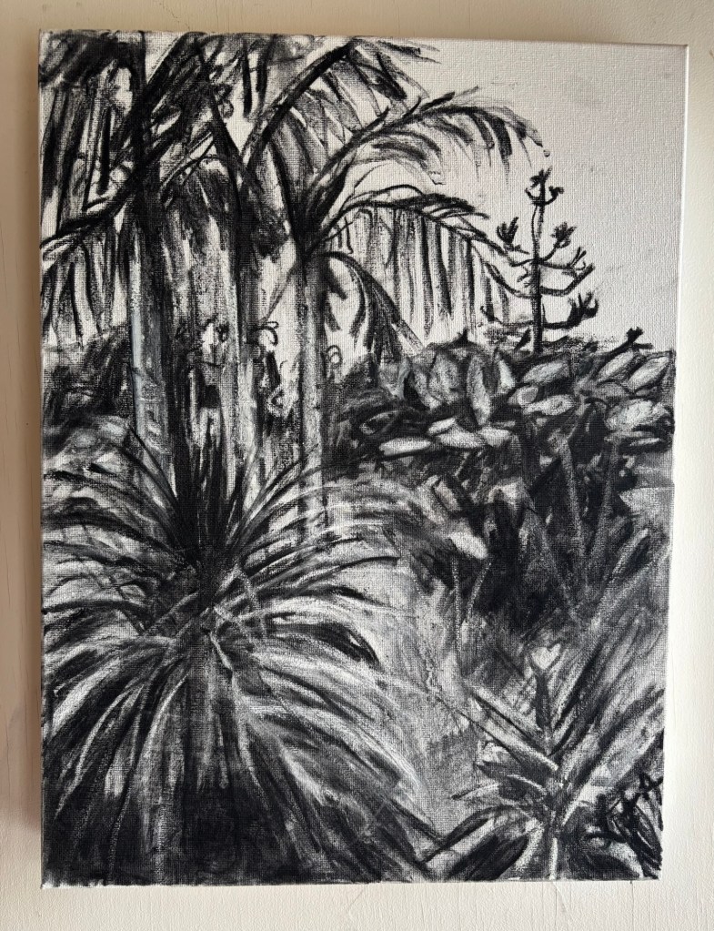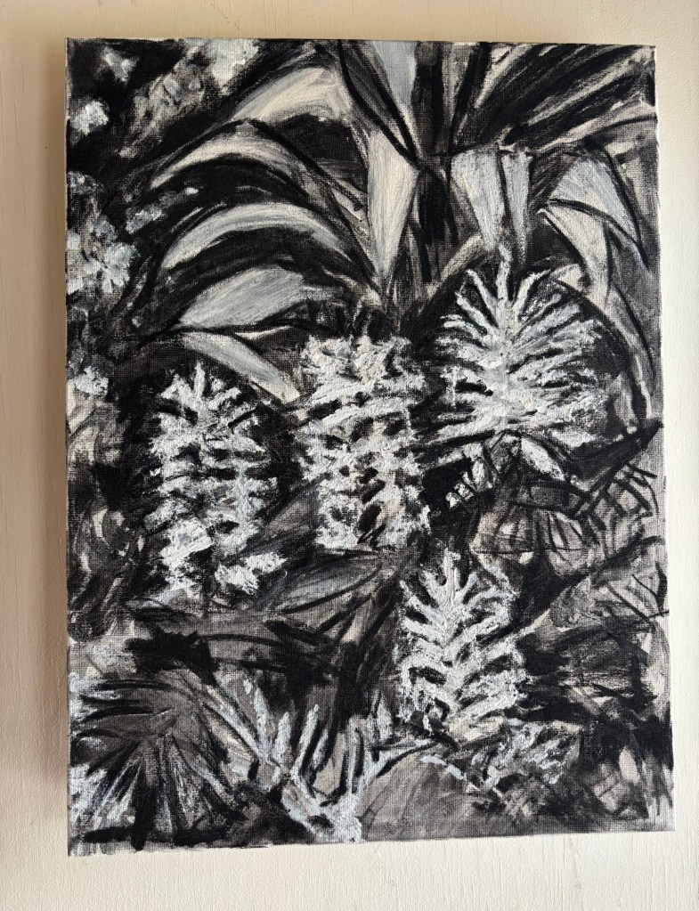 Unusual for me not to use colour! I drew with charcoal then added some wet brushwork followed by a little acrylic paint in white. Inspired by my garden on Mackellar Range, Larnook NSW. click to see all images