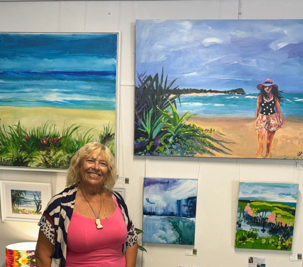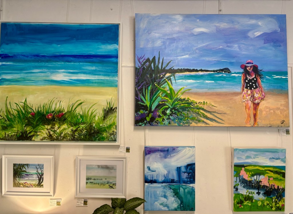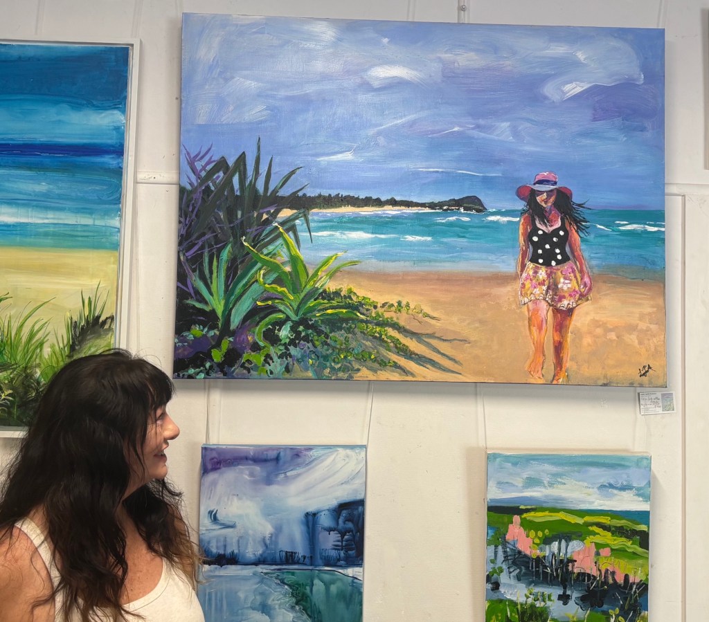 My latest large painting of a friend on our local beach. Acrylic and oil pastel on canvas. On display at Iluka Emporium
