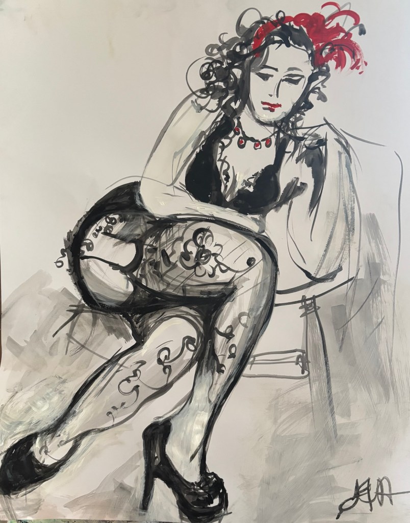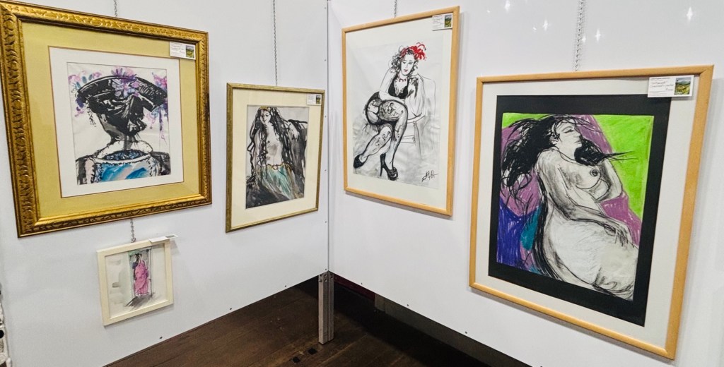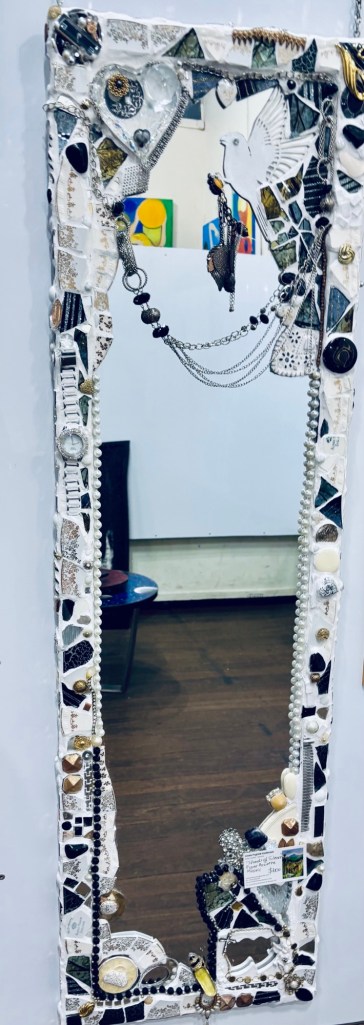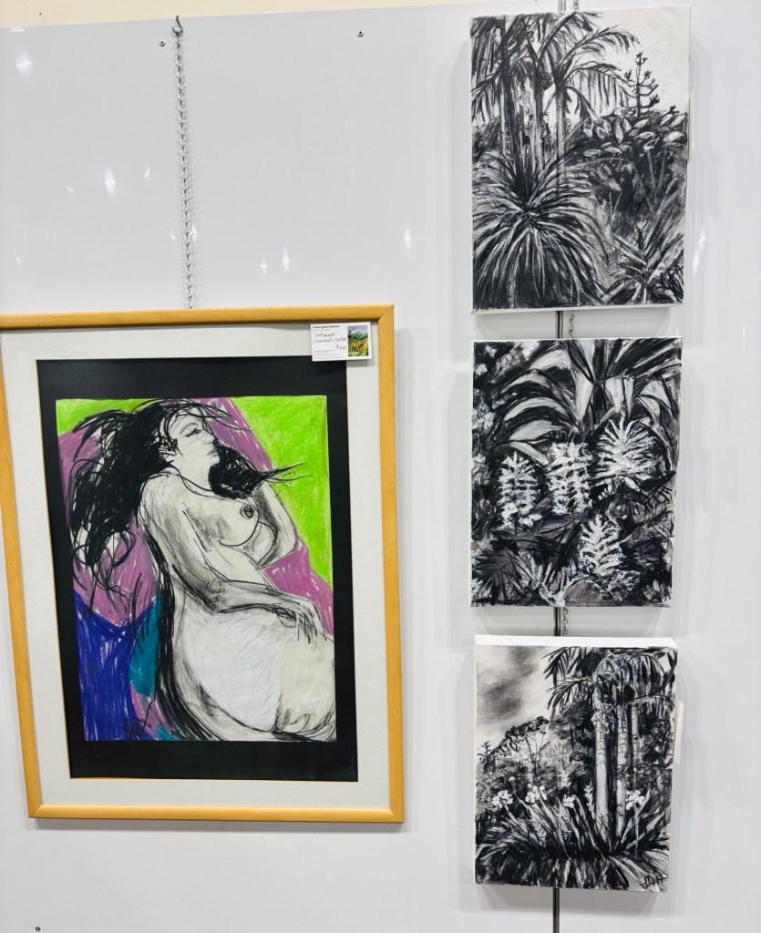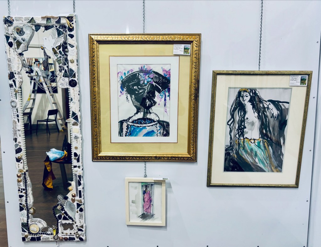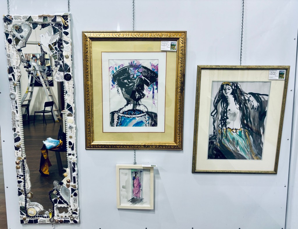 My theme for this Art Fair is Black and White. I’ve included Life Drawings, (Empress, Mermaid, Untamed and Show Girls Pause)bush drawings and a pique assiette wall mirror. (Shards of Silence) I’ve used charcoal, ink, watercolour and pique assiette mosaic items. Click on this image to see them all in detail.