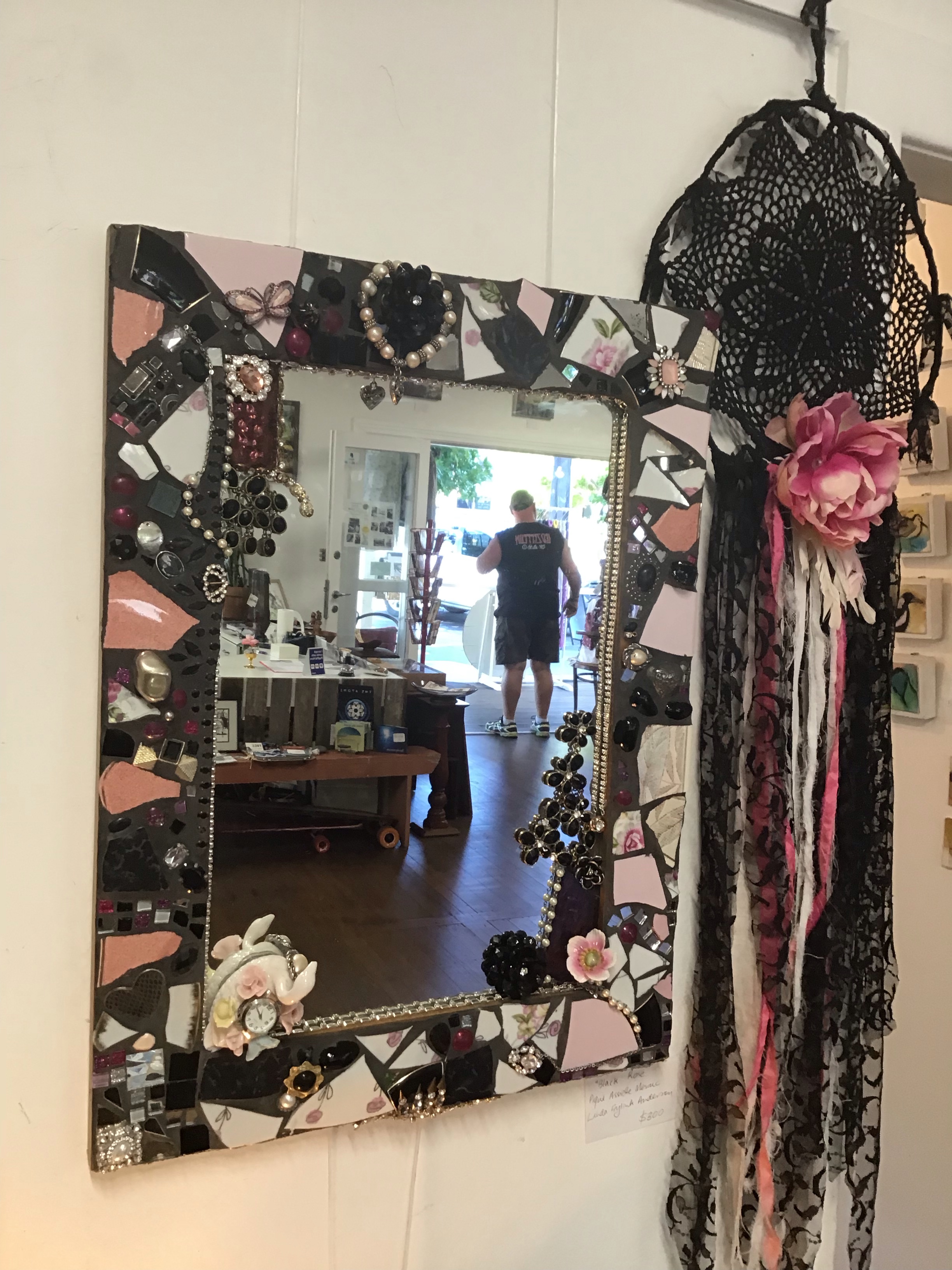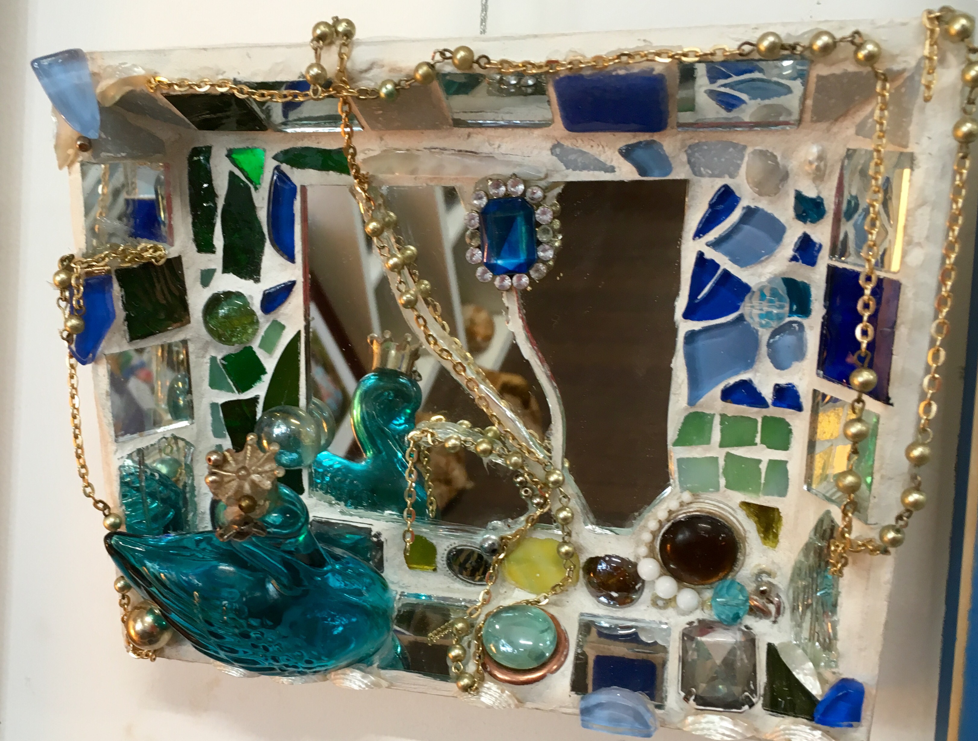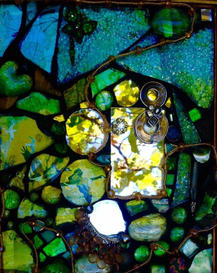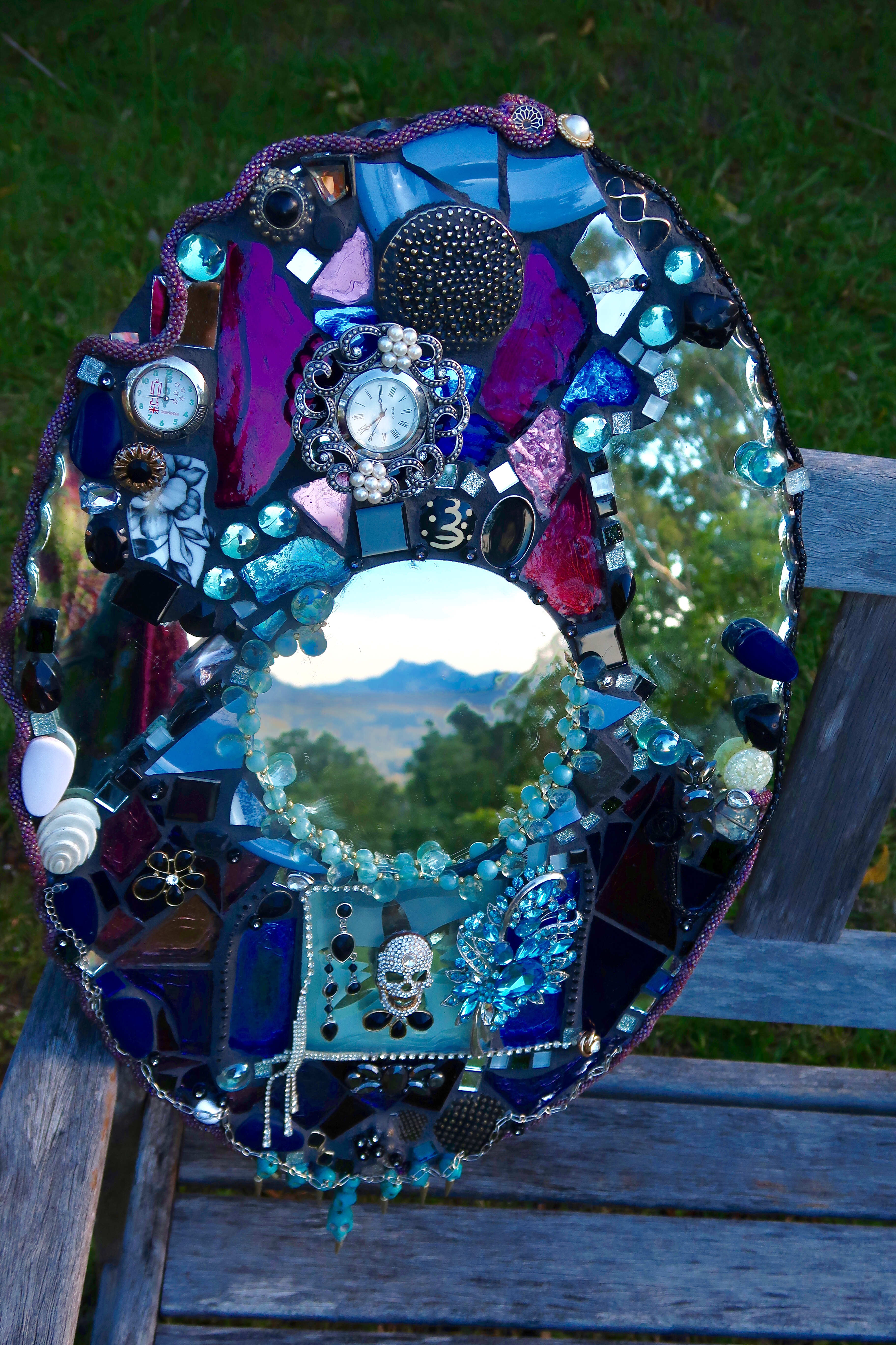 “My style of mosaic art is ‘pique assiette’ which means I use broken china, glass and recycled objects and collectibles such as old jewellery to create unique one of a kind mirrors, frames and freestanding artworks. Each piece tells a story – I often use memories from our travels around the world recreating the colours and textures and are of a whimsical nature.I enjoy searching for unique collectibles and spend many hours in my studio surrounded by nature as I work. It’s almost a kind of meditation for me.”