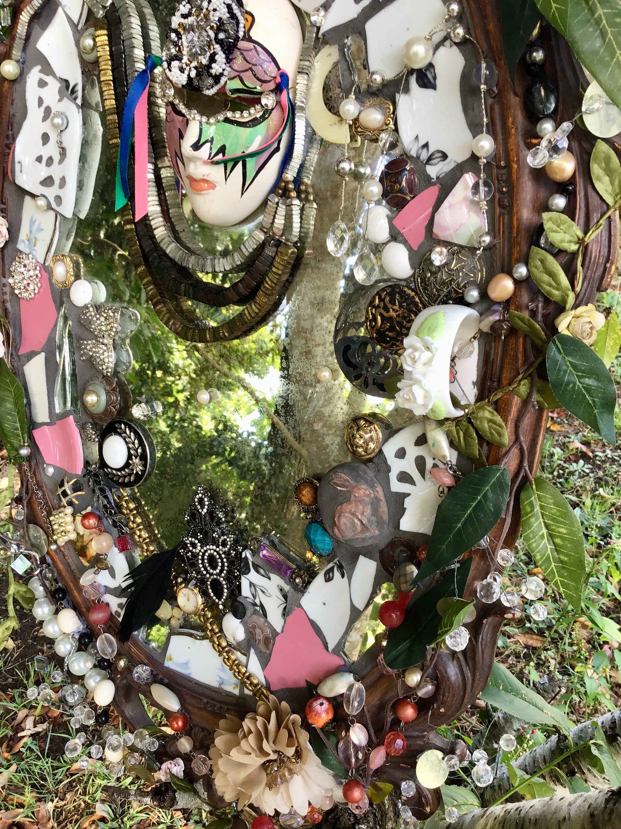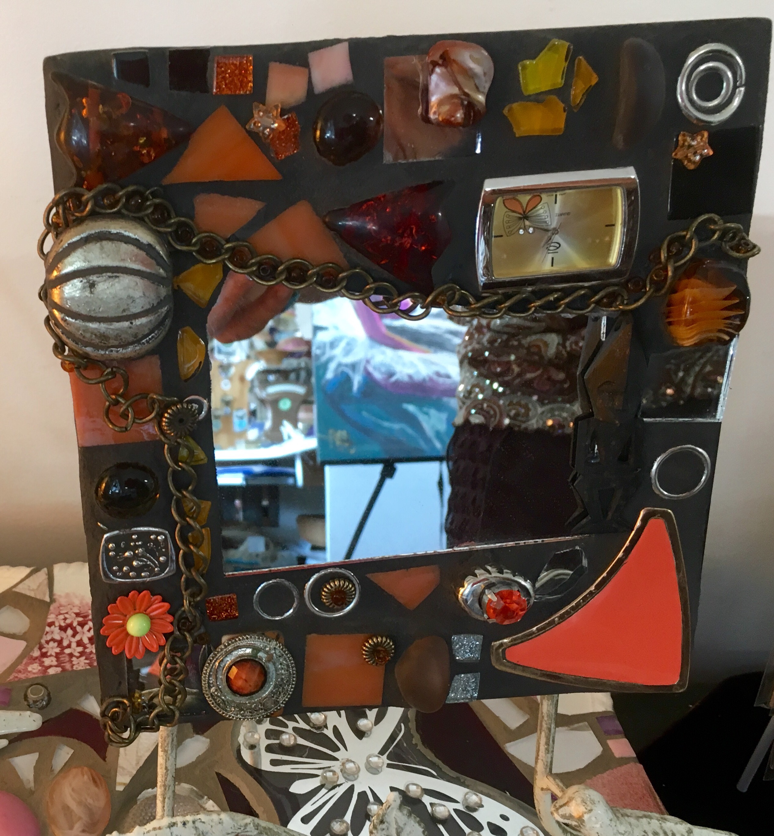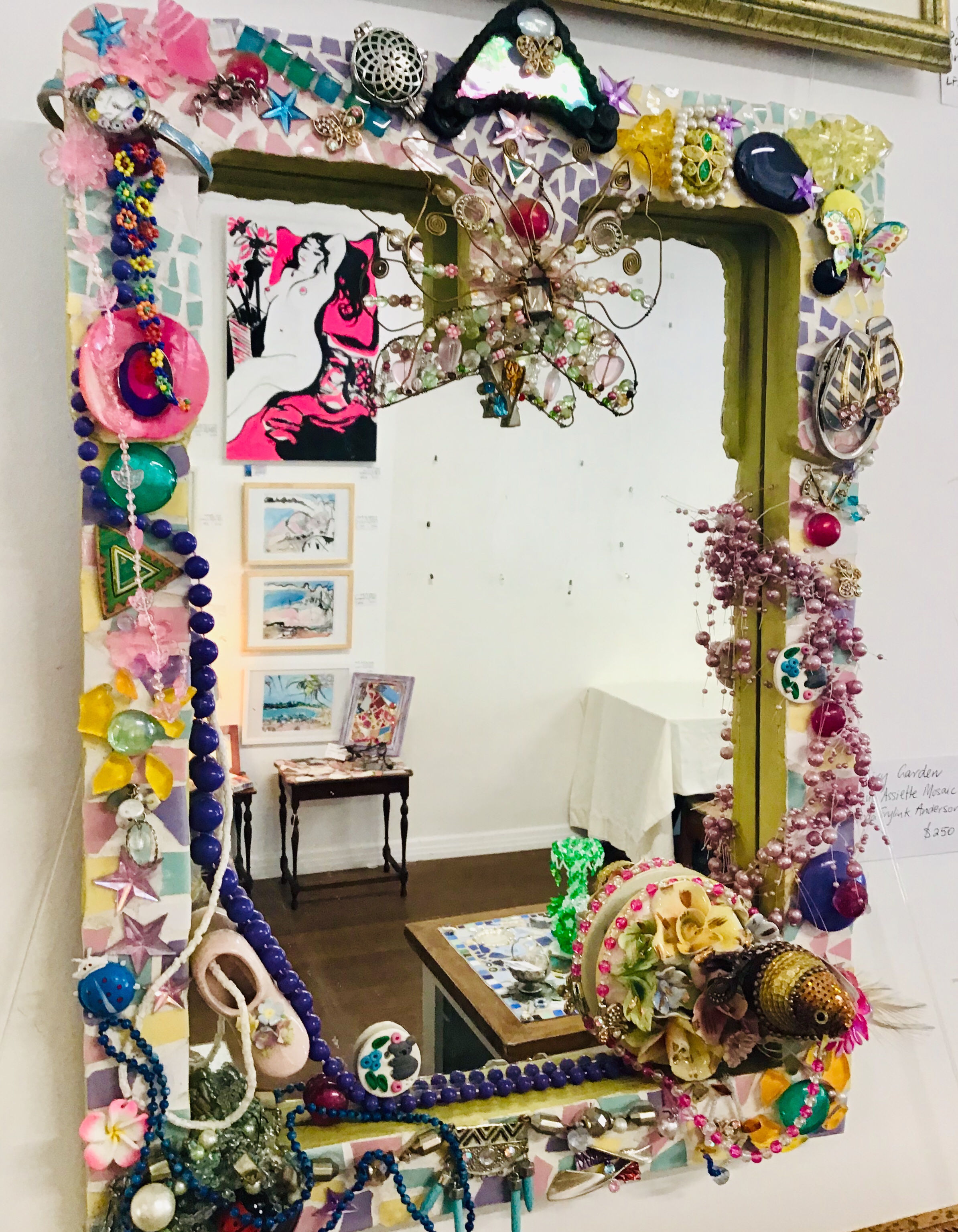 “My style of mosaic art is ‘pique assiette’ which means I use broken china, glass and recycled objects and collectibles such as old jewellery to create unique one of a kind mirrors, frames and freestanding artworks. Each piece tells a story – I often use memories from our travels around the world recreating the colours and textures and are of a whimsical nature.I enjoy searching for unique collectibles and spend many hours in my studio surrounded by nature as I work. It’s almost a kind of meditation for me.”