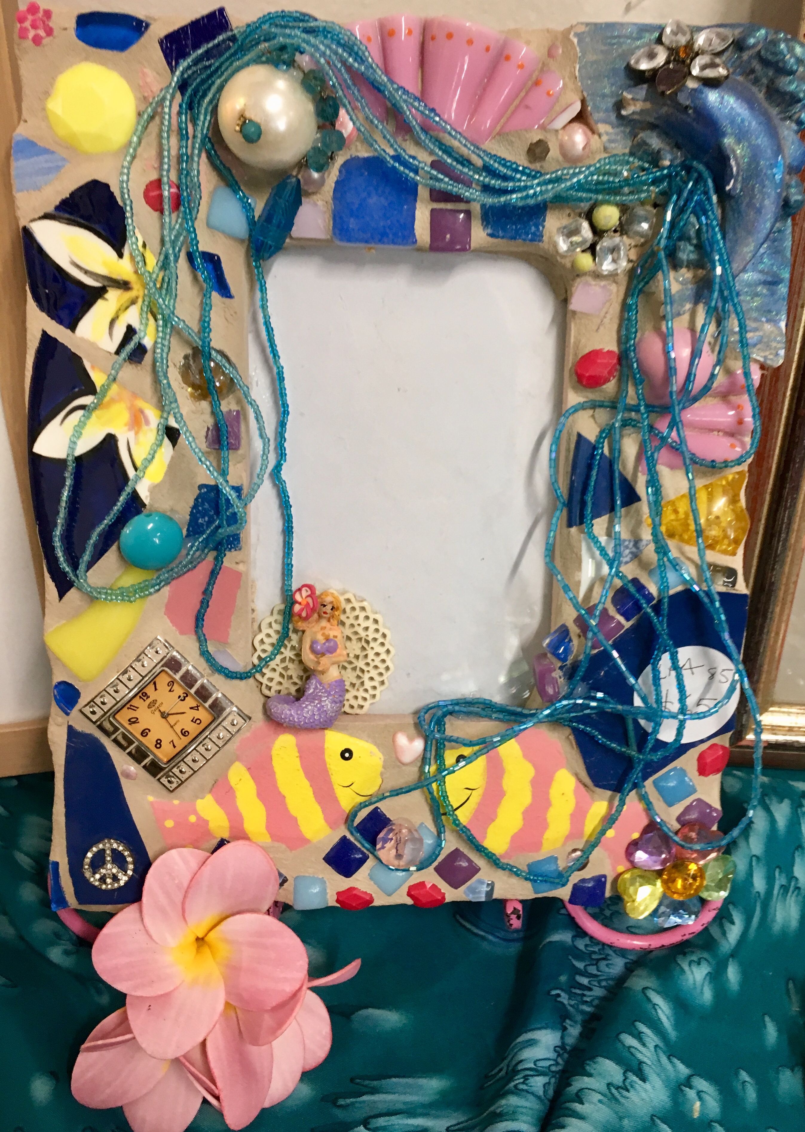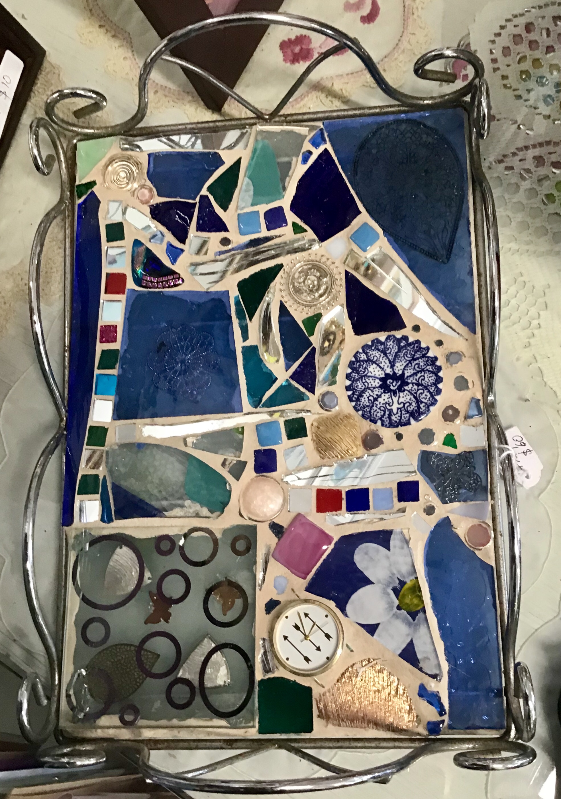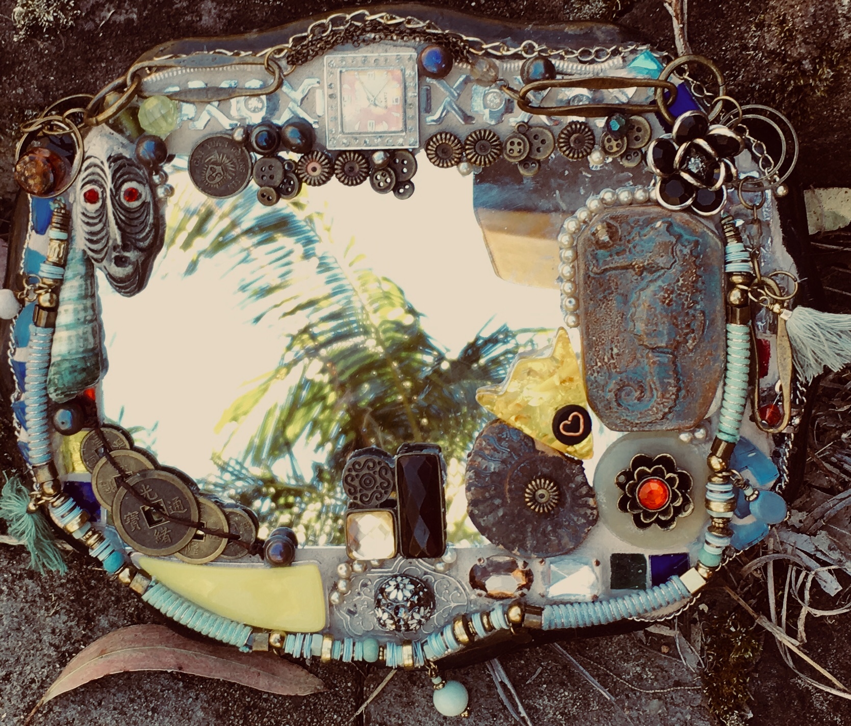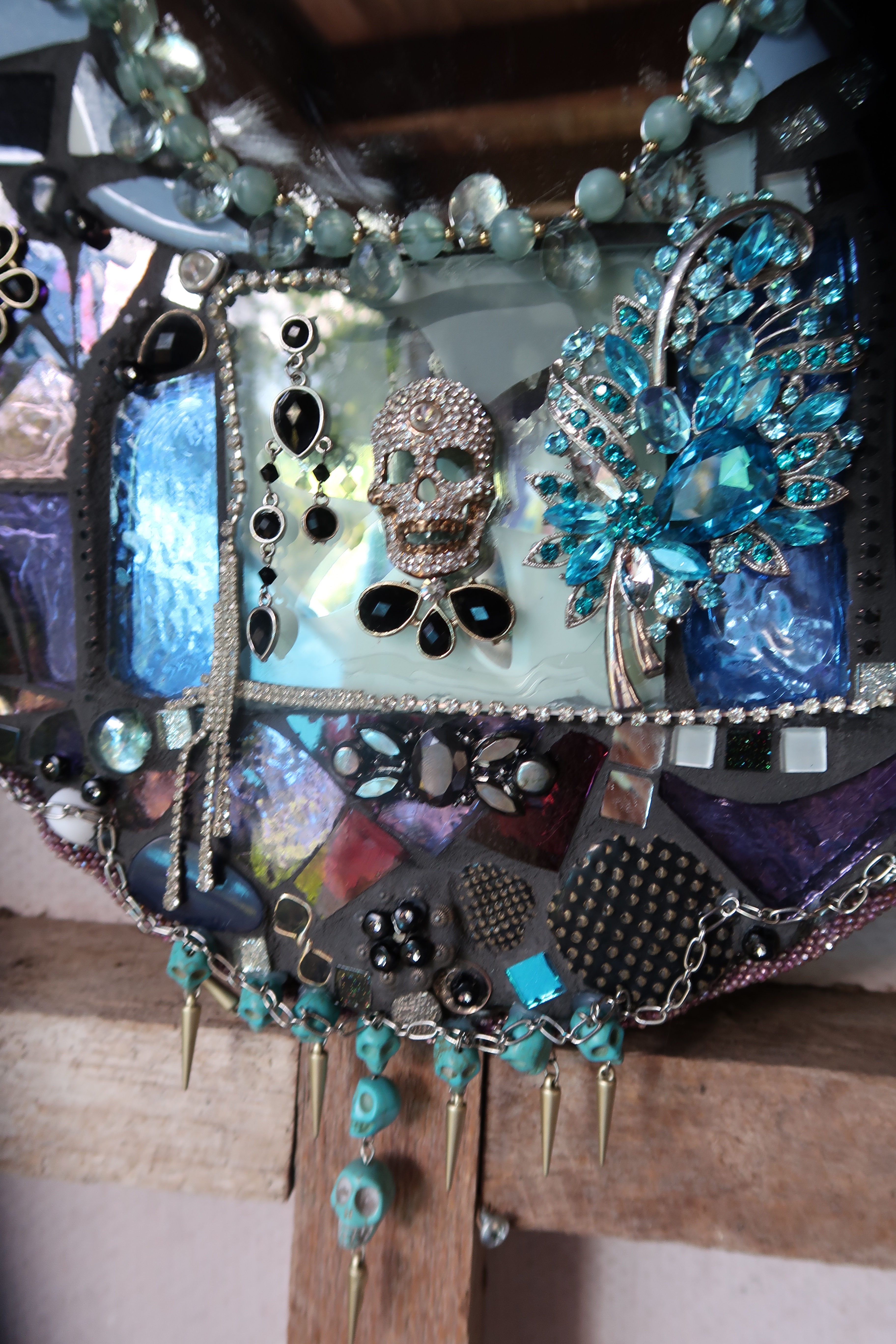 “My style of mosaic art is ‘pique assiette’ which means I use broken china, glass and recycled objects and collectibles such as old jewellery to create unique one of a kind mirrors, frames and freestanding artworks. Each piece tells a story – I often use memories from our travels around the world recreating the colours and textures and are of a whimsical nature.I enjoy searching for unique collectibles and spend many hours in my studio surrounded by nature as I work. It’s almost a kind of meditation for me.”